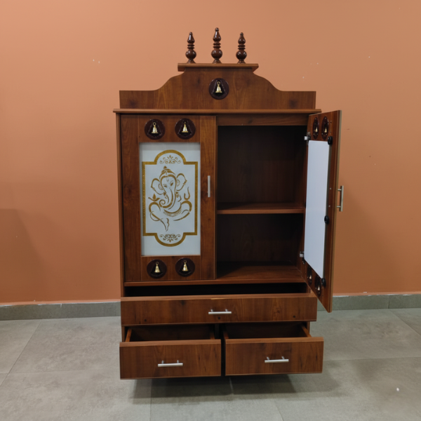 Create a peaceful prayer corner in your home with this elegant brown colour puja stand made from high quality particle board. These are the same boards that we use for our Wardrobes in the store. It comes with a clean and neat finish that gives a rich wooden look and blends well with all types of interiors. This puja unit is ideal for daily worship and festive prayers. Its compact design fits perfectly in living rooms, bedrooms, or pooja areas. We have other sizes and colors in this Pooja stand