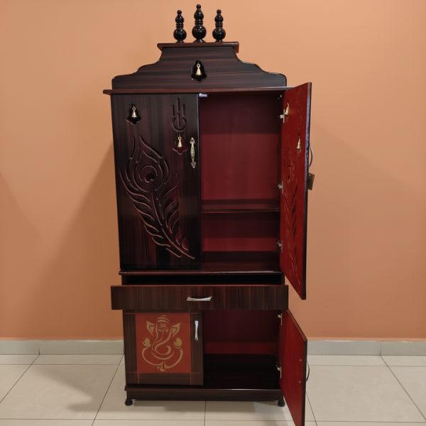 This beautiful puja stand is made from strong and durable MDF boards with an elegant rosewood color finish that gives a rich wooden look. It is perfect for daily pooja and special occasions. The compact and neat design fits easily in living rooms, bedrooms, or small prayer areas. The smooth MDF surface is easy to clean and maintain, making it ideal for long-term use. This stylish and affordable MDF puja stand adds a peaceful and traditional touch to your home.