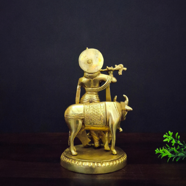 This statue standing at 9 inches tall depicts the Lord with the cow in a pose that he is most commonly referred to. Great attention has been paid to the main idol as well as the cow.