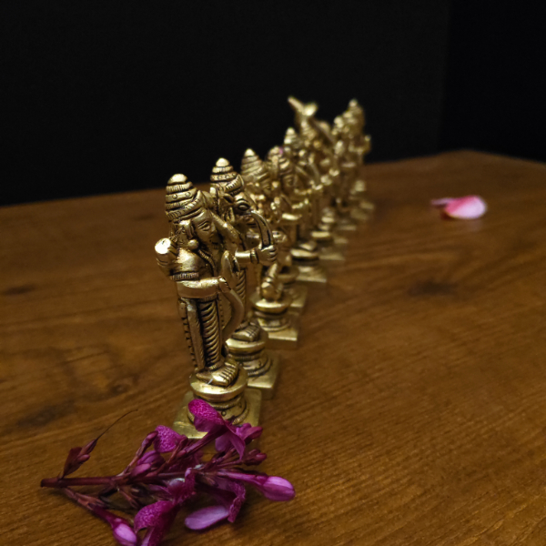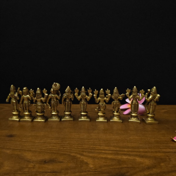 This Dasavatharam set is crafted in brass with neat finishing, representing the ten avatars of Lord Vishnu. Ideal for pooja, collections, or gifting, available in Tulsi Home Store.