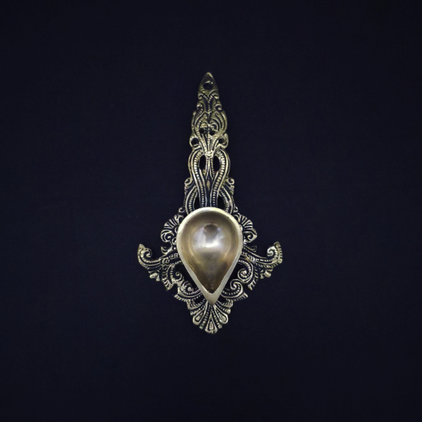 This is a stunning brass ceremonial spoon with a teardrop-shaped bowl set against a wide, intricately patterned handle. The handle features elaborate floral and paisley-inspired motifs with symmetrical curves, reflecting classical Indian design elements. Its ornamental style and precise detailing make it a perfect piece for pooja rituals, or as an accent in traditional decor settings.