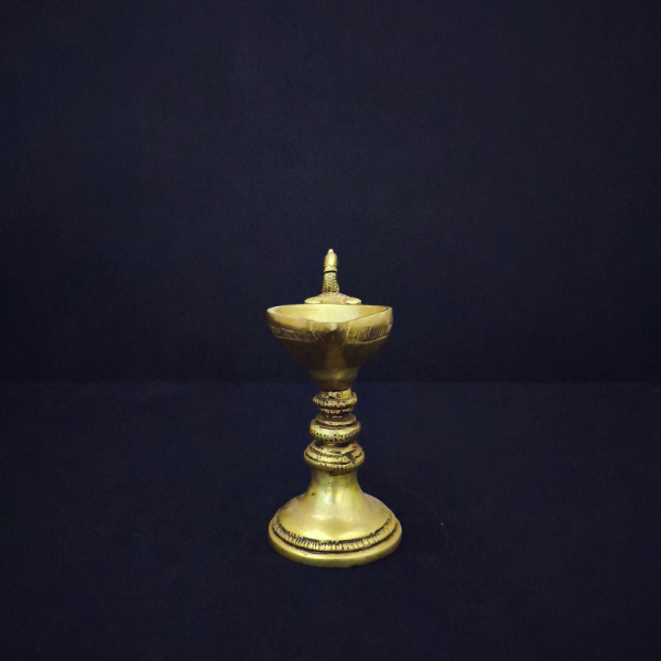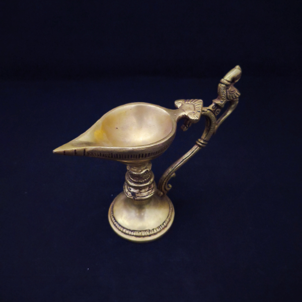 This brass oil lamp (diya) with a high pedestal and a beautifully sculpted handle features a bird motif at the top. The lamp has a smooth, polished surface with detailed etching around the edges, exuding a sense of cultural richness and artisanal finesse. The deep spouted bowl and elevated design make it a striking piece for ritual or décor. This design can also be used during arthi by holding on to the curved handle.