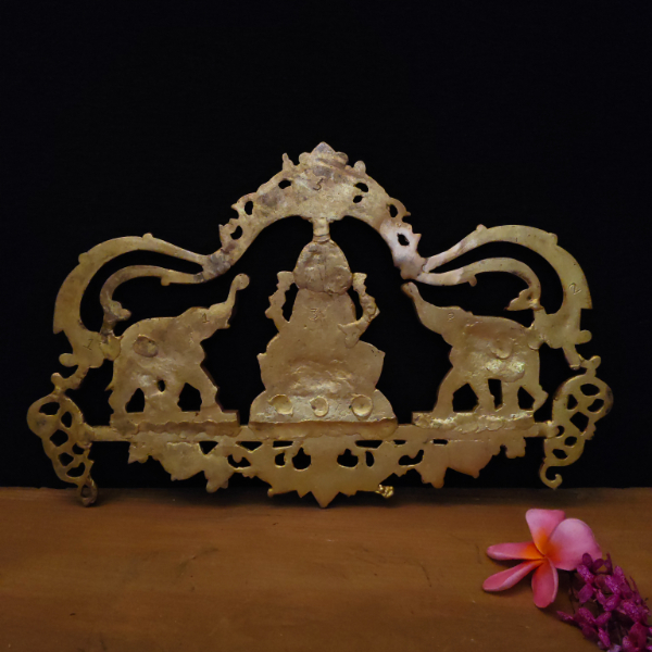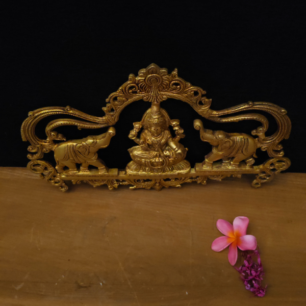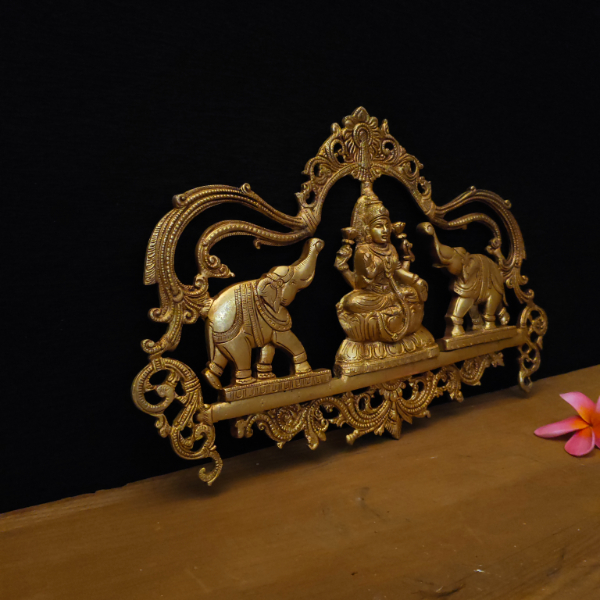 This Pure Brass Gaja Lakshmi Wall Hanging features Goddess Lakshmi seated at the center with two elephants on either side, symbolizing prosperity, wealth, and auspiciousness. The beautifully detailed arch design adds a grand traditional touch.
