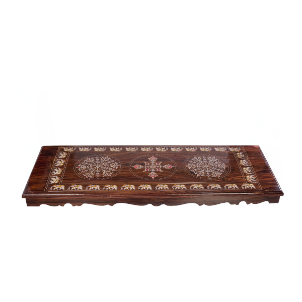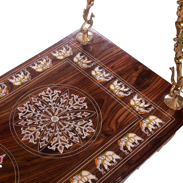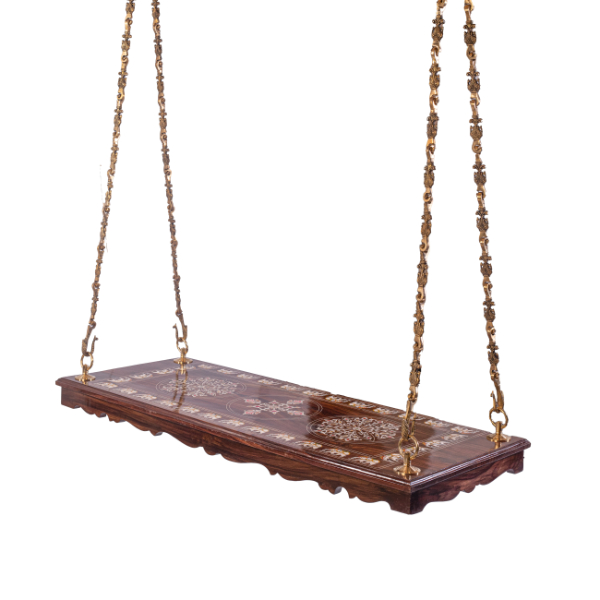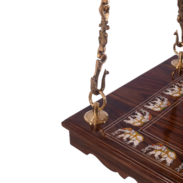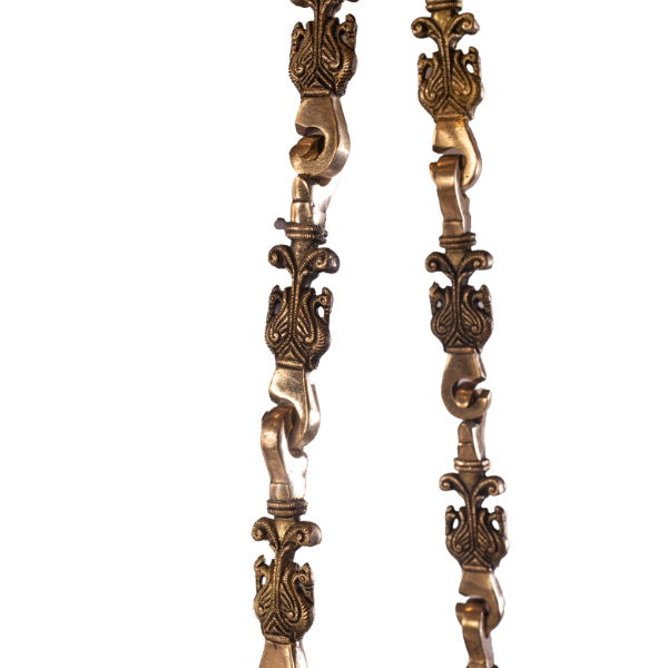 We sell several designs of brass chains that can be found in this site as well. As shown here, suspended by intricately designed brass chains, this swing exudes vintage charm. The chains are crafted with exquisite detailing, featuring the Annai pakshi that enhance its retro aesthetic. The brass not only provides a sturdy and reliable suspension but also complements the rose wood with its warm golden hue, creating a harmonious contrast.