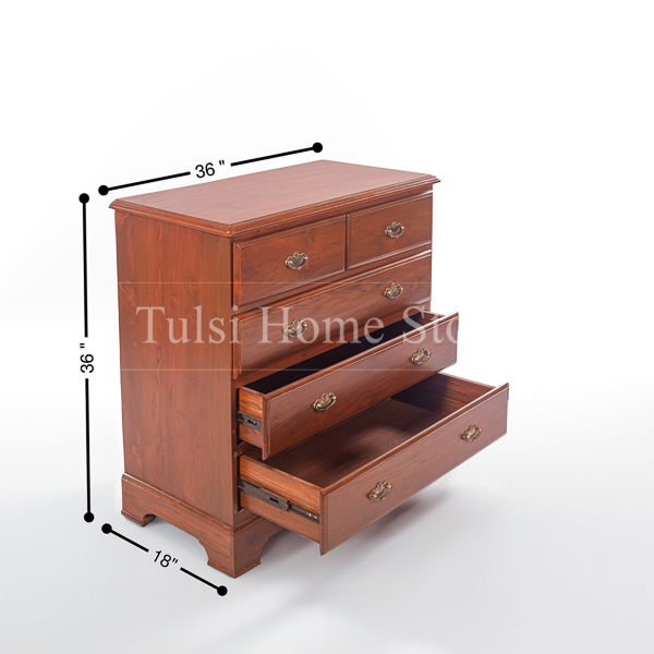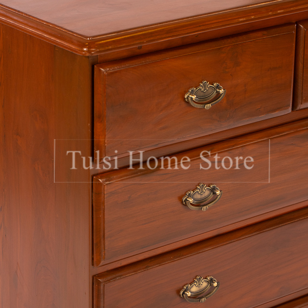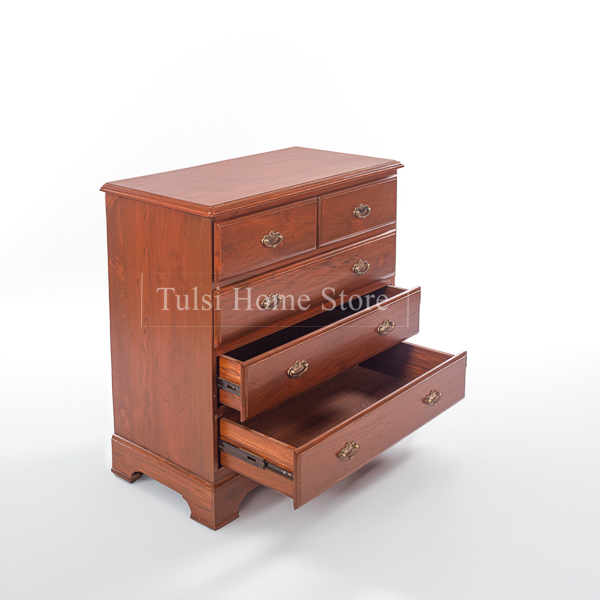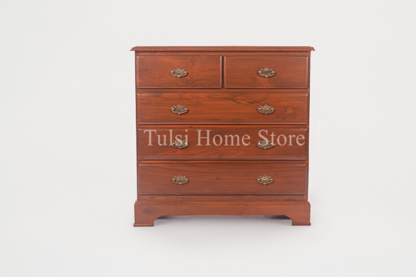 This classical chest of draws has been on our product line for over decades now. It has not lost its charm and is an evergreen bestseller. This chest of drawers is versatile and can be placed in bedrooms, living areas, or even dining spaces for storing linens, light crockery, or personal belongings. The chest features five drawers in a tiered configuration, providing ample storage. The two upper drawers are smaller, ideal for organizing smaller items like documents or accessories, while the three larger drawers below can accommodate bulkier items. Each drawer is adorned with ornate metal handles, adding a vintage touch to the overall aesthetic. The flat top can be used to display decorative items like statues, lamps, photo frames, or vases.