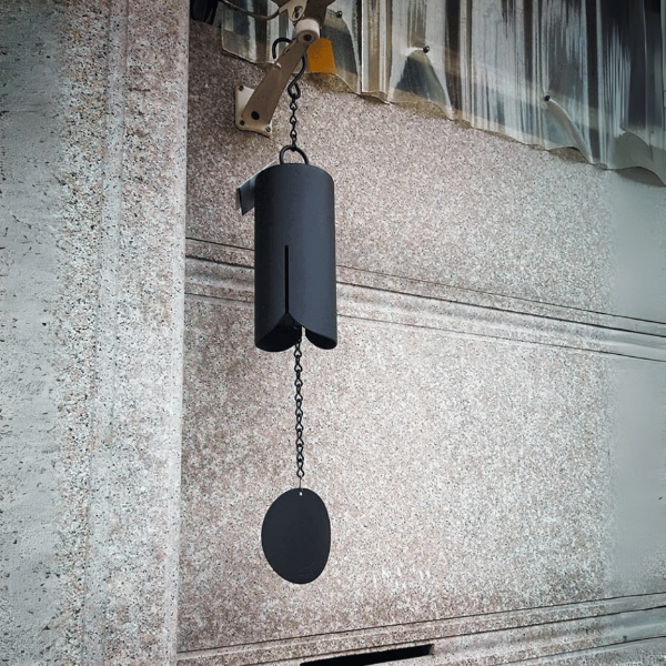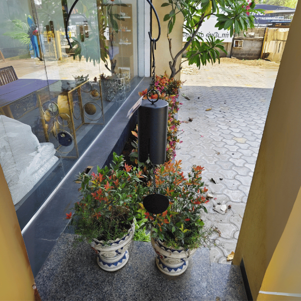 The wind chimes in the Tulsi Home Store are made of aluminum with a black color. They give a soft sound in the breeze and are good for home or balcony use.