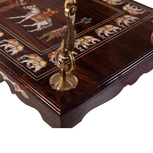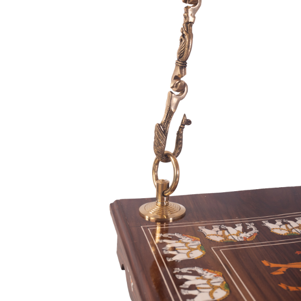 We sell several designs of brass chains that can be found in this site as well. As shown here, suspended by intricately designed brass chains, this swing exudes vintage charm. The chains are crafted with exquisite detailing, featuring the Annai pakshi that enhance its retro aesthetic. The brass not only provides a sturdy and reliable suspension but also complements the rose wood with its warm golden hue, creating a harmonious contrast.