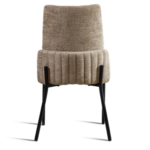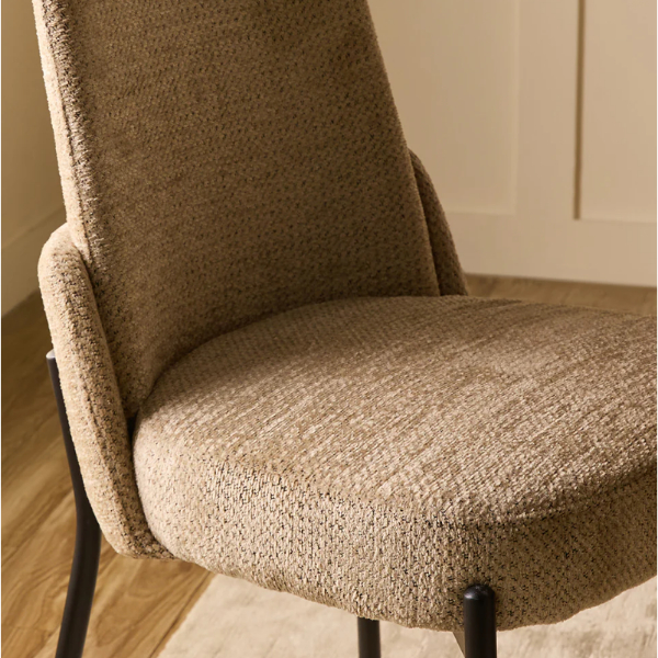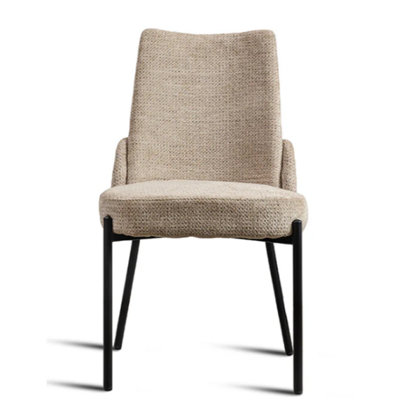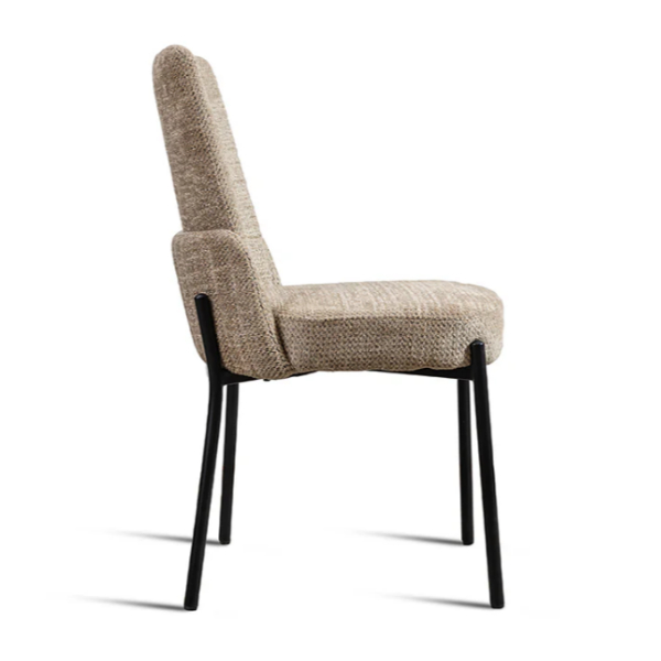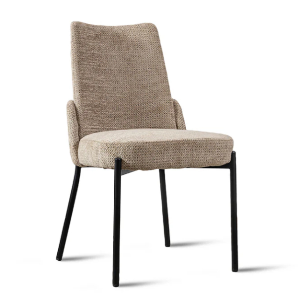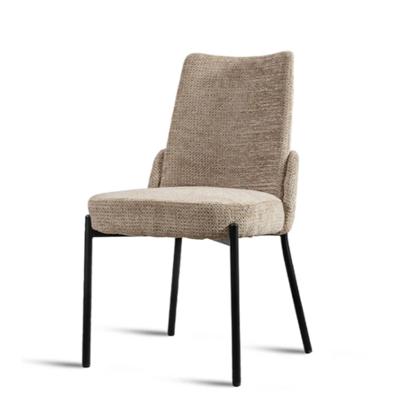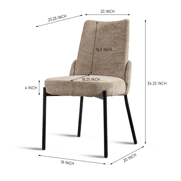 Flair is a statement dining chair made from soft cotton blend fabric and sturdy metal legs. Its well designed backrest is just perfect for almost anyone. We have checked this chair at our showroom and it has good a good response. The chair features a gently curved high back and plush seat Its sleek look makes it a perfect compliment to most dining tables. You could add this dining chair to a table with a wood, glass or marble top. To add to the looks, the textured beige fabric and slim black metal legs will go with almost any shade or finish of dining table.