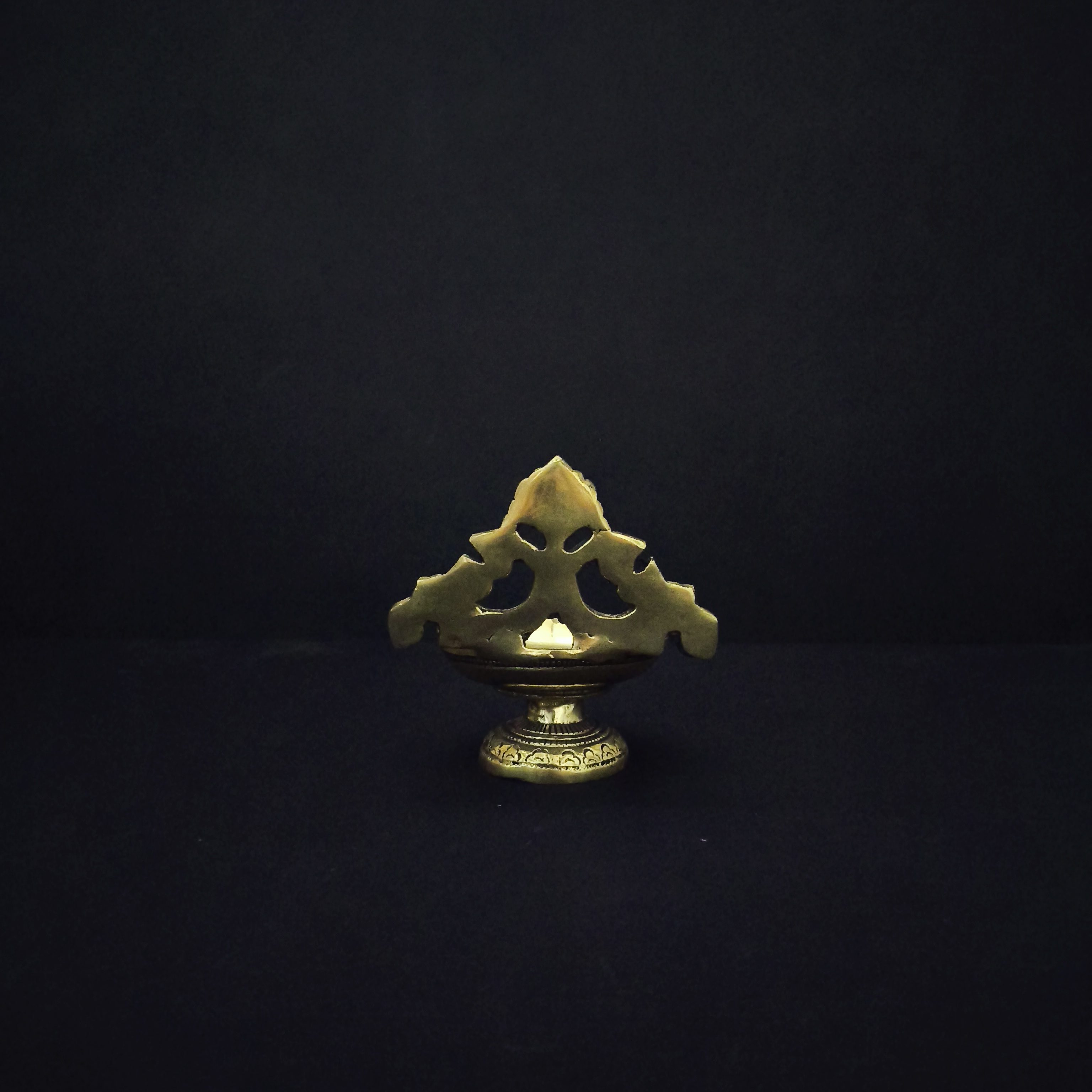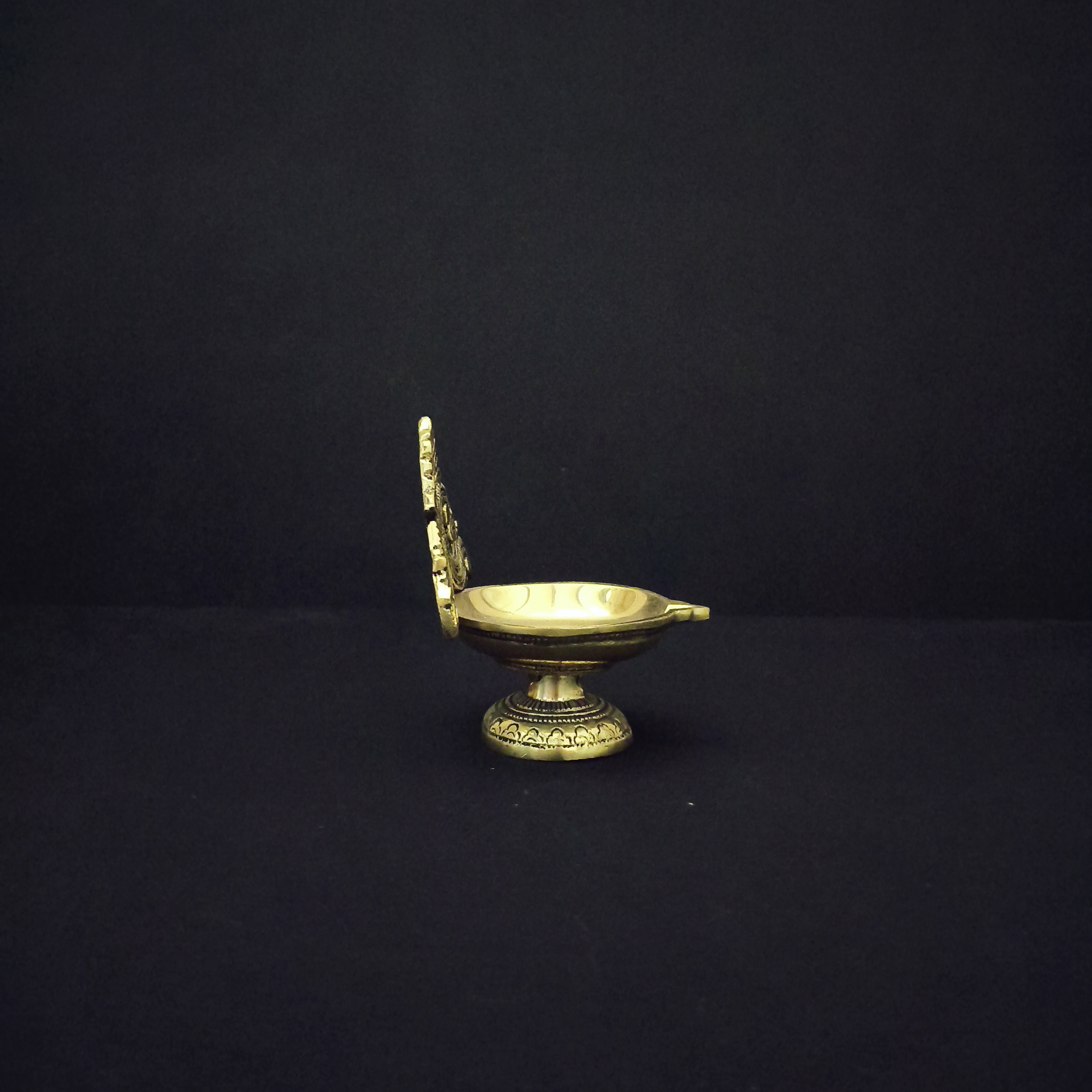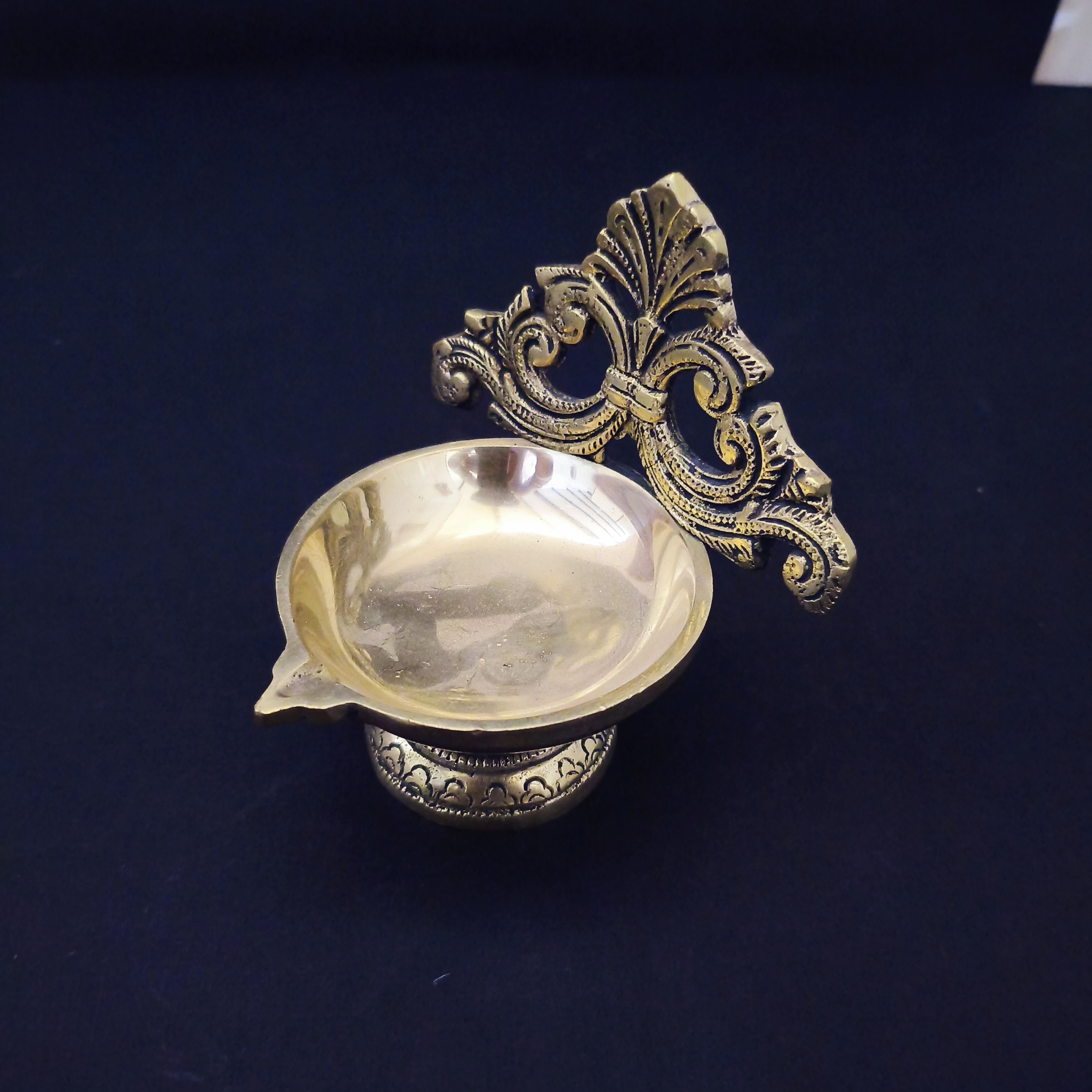 This traditional brass oil lamp (diya) with an ornate handle and a tear-drop shaped space that holds the oil and wick. The design features an intricate carved frame that can be held as well and given a polished golden finish. Used in Indian rituals and home decor.
