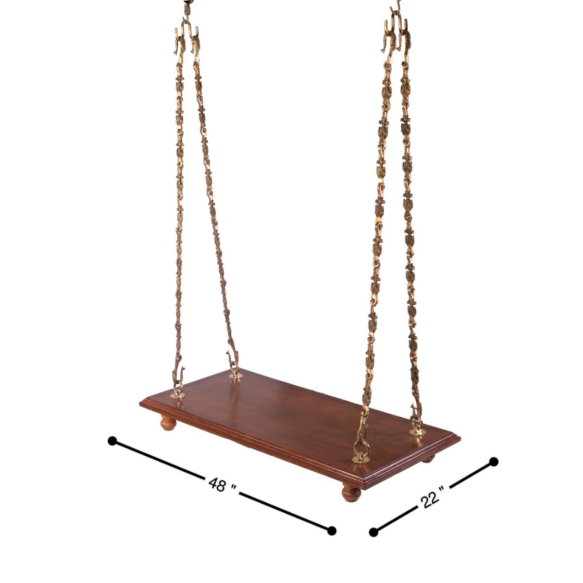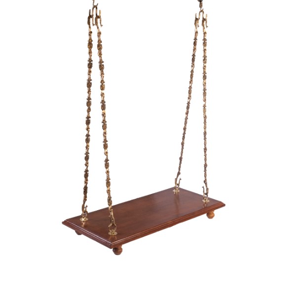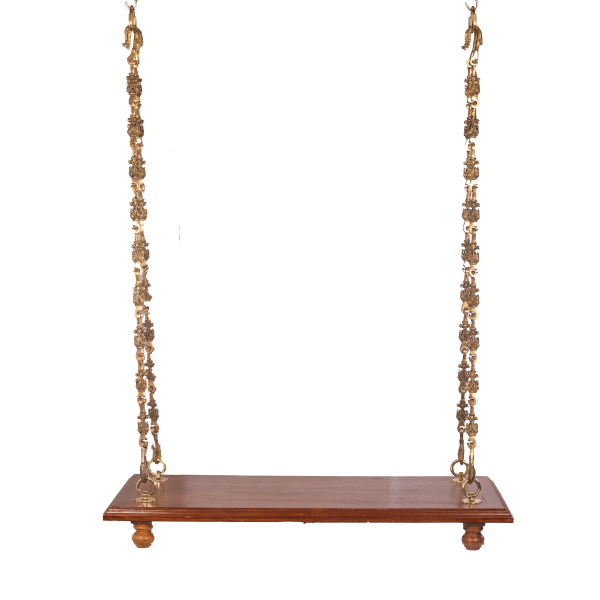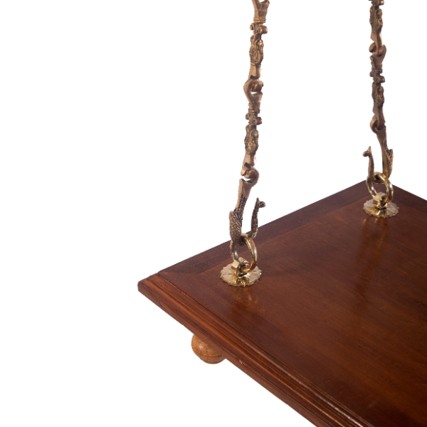 We sell several designs of brass chains that can be found in this site as well. As shown here, suspended by intricately designed brass chains, this swing exudes vintage charm. The chains are crafted with exquisite detailing, featuring the Annai pakshi that enhance its retro aesthetic. The brass not only provides a sturdy and reliable suspension but also complements the teak wood with its warm golden hue, creating a harmonious contrast.