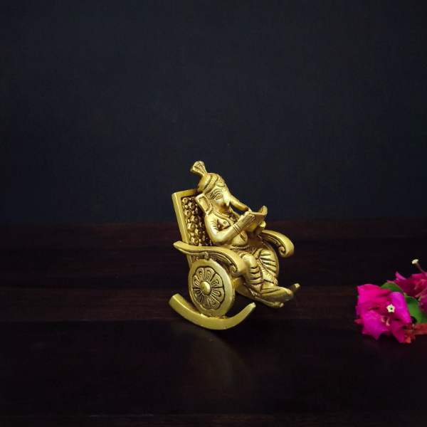 A unique and artistic depiction of Lord Ganesha, this brass idol features Him seated gracefully on a traditional chair, radiating calm, wisdom, and authority. Meticulously handcrafted in solid brass, the idol blends divine symbolism with regal elegance, making it a standout piece for both worship and décor.
