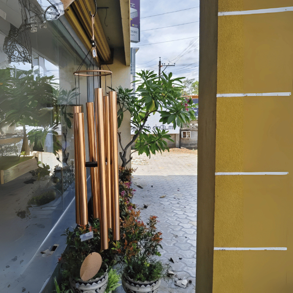 The wind chimes in the Tulsi Home Store are made of aluminum with a rose gold color. They give a soft sound in the breeze and are good for home or balcony use.