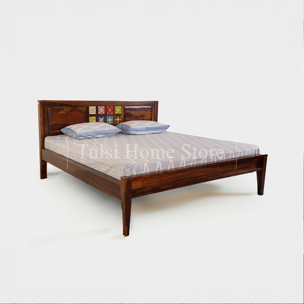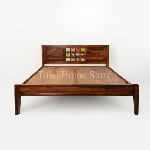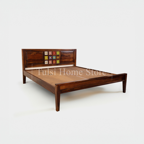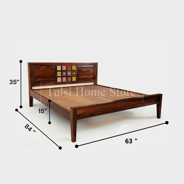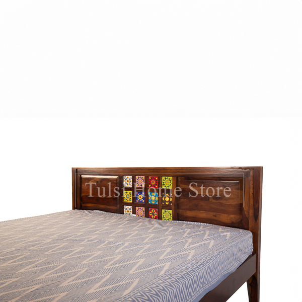 Introducing Kahaan, a majestic yet humble Queen-size cot that exudes elegance and comfort. Crafted with the finest solid Sheesham wood, this bed is a tribute to the timeless beauty of nature. The rich, warm tones of Sheesham wood infuse your space with a touch of rustic charm, creating a welcoming ambiance for restful nights. Designed with simplicity in mind, the Kahaan cot features a stunning headboard adorned with colorful tiles, adding a delightful pop of artistry to the overall design. Each tile is carefully hand-selected to complement the natural grain patterns of the sheesham wood, creating a harmonious blend of craftsmanship and style.