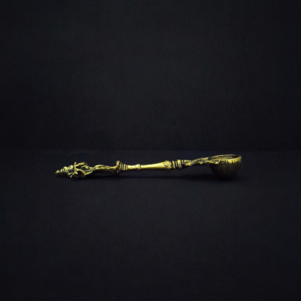 This is a traditional brass pooja spoon featuring a finely detailed figure of Lord Krishna playing the flute, seated gracefully at the top of the handle. The handle tapers elegantly with ornamental ridges, leading down to a small rounded bowl adorned with intricate floral and yali-like carvings at the base. This ceremonial spoon is often used in devotional rituals and offerings, embodying both spiritual essence and artistic heritage.