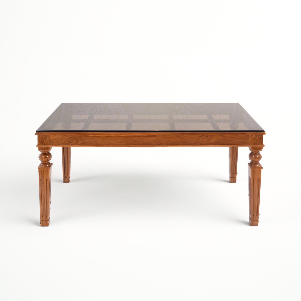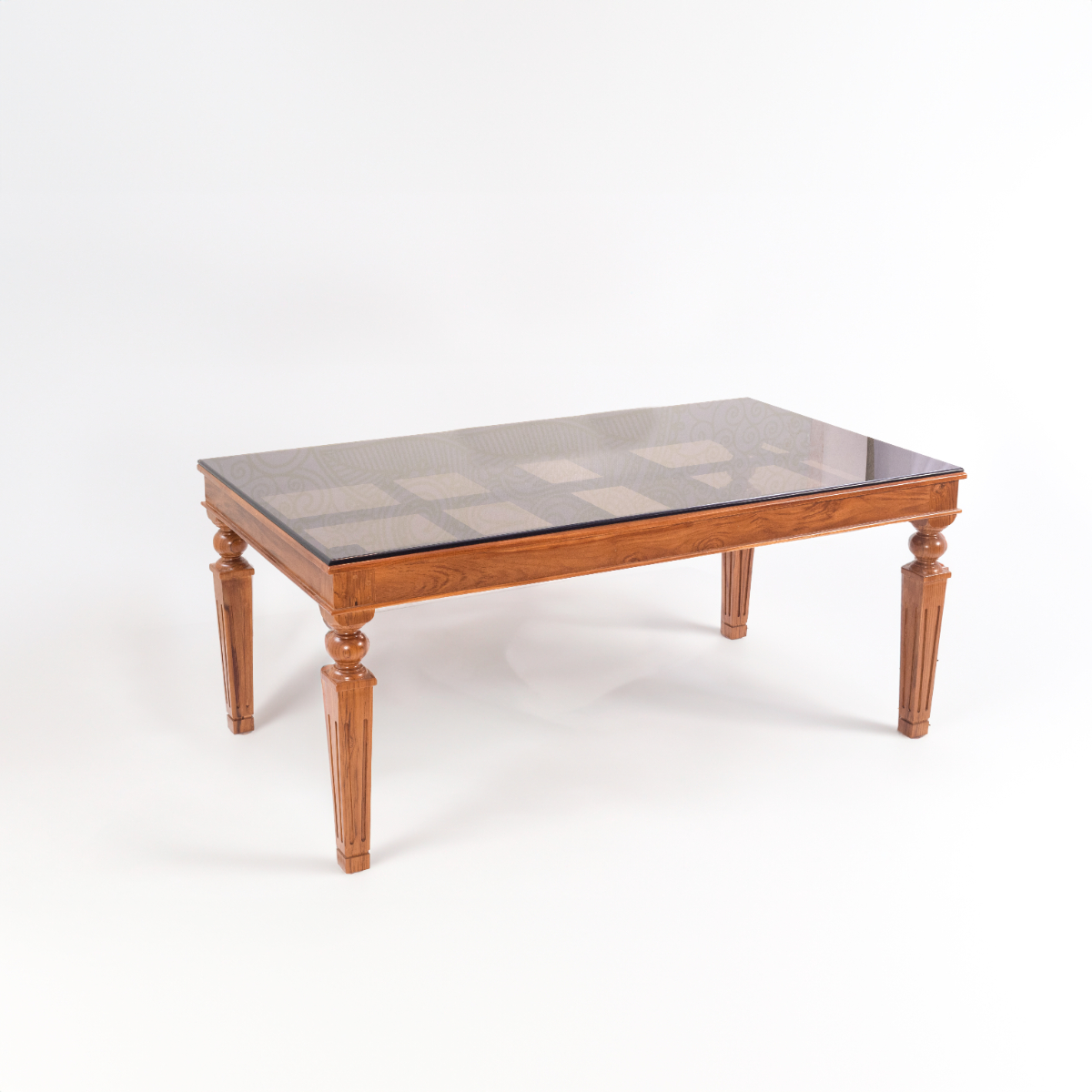 Add a traditional charm to your dining space with this expertly crafted dining set. The solid Teak table, with its durable top and semi matte finish, will easily accommodate six for dinner. The top side Teak frame has been meticulously carved by hand. Standing on sturdy and elegant Carved 4 legs, it pairs up with Six Teak wood dining chairs. Angled back rest on the chairs enables the perfect posture. This design has been a consistently strong seller. Classic teak designs never fade with time.