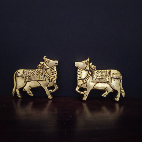 The centerpiece is a stylized lotus flower, intricately made with overlapping petals, symbolizing purity and spiritual awakening in many Indian traditions. Flanking the lotus on either side are two matching brass Nandi (sacred bull) figurines. Each Nandi is adorned with traditional Indian patterns and ornamental saddles, giving them a regal and auspicious appearance. The overall aesthetic is elegant and devotional, suitable for home décor or a spiritual altar.