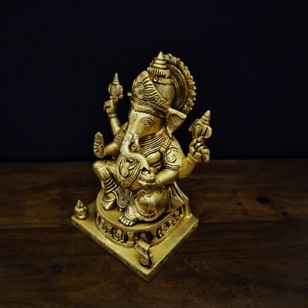 Change your pooja room with this pure brass Ganesha idol from Tulsi Home Store. Crafted with fine details and a shining golden finish, this beautiful statue brings wisdom, good fortune, and elegance to your sacred space. Perfect for pooja, decoration, or gifting, visit Tulsi Home Store today to make this special piece yours. Notice the base that has various depictions of the modern ganesh. This statue at about 9.5 inches will be a good buy to keep as a central piece on your console at the entrance of your home or office.