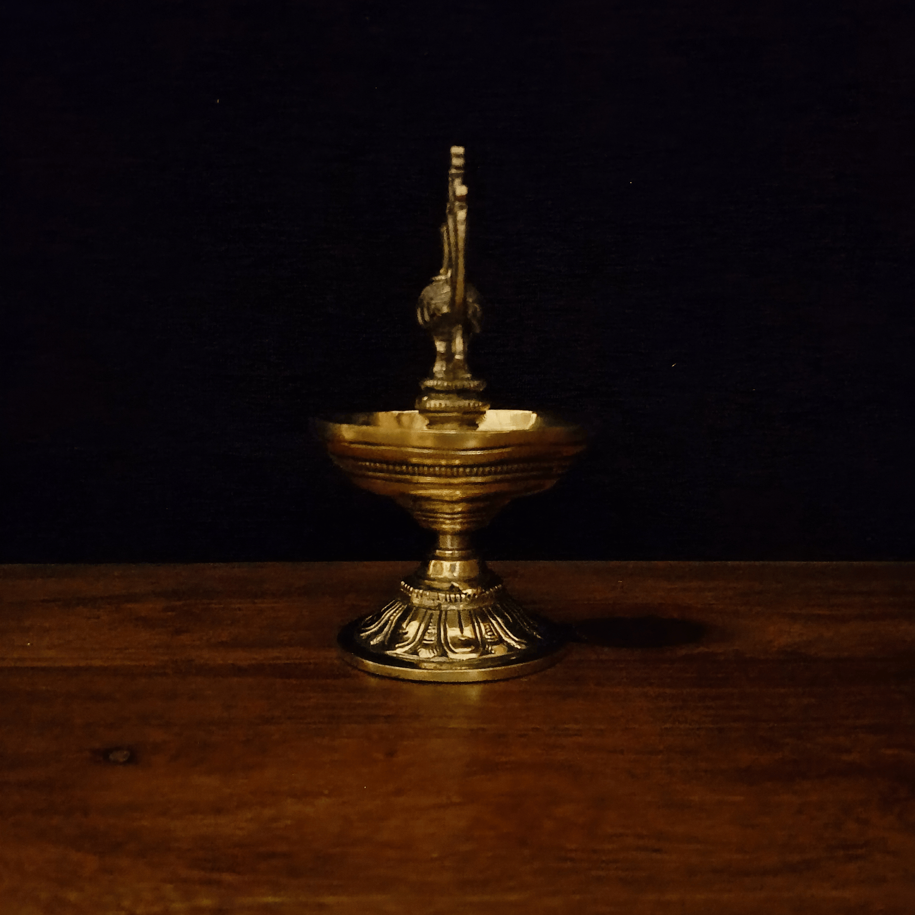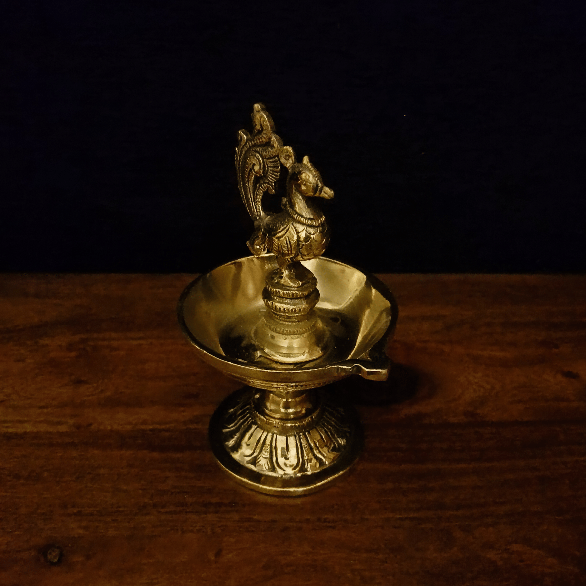 The Peacock Standing Lamp in Tulsi Home Store is made of brass and has a fine peacock design. A good choice for pooja, festivals, and home decoration.