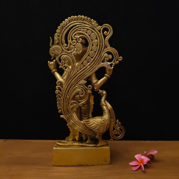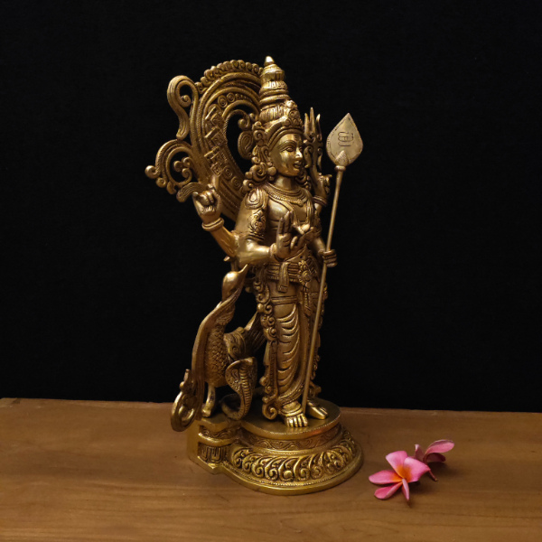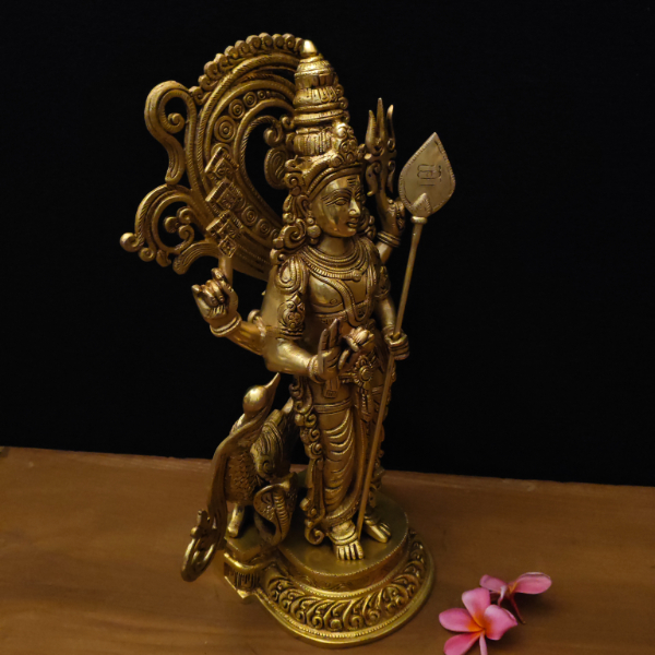 This Pure Brass Murugan Idol is beautifully crafted with detailed traditional carvings, showcasing Lord Murugan holding the Vel (spear), symbolizing power, wisdom, and protection. The elegant arch design and peacock detail enhance its divine presence.