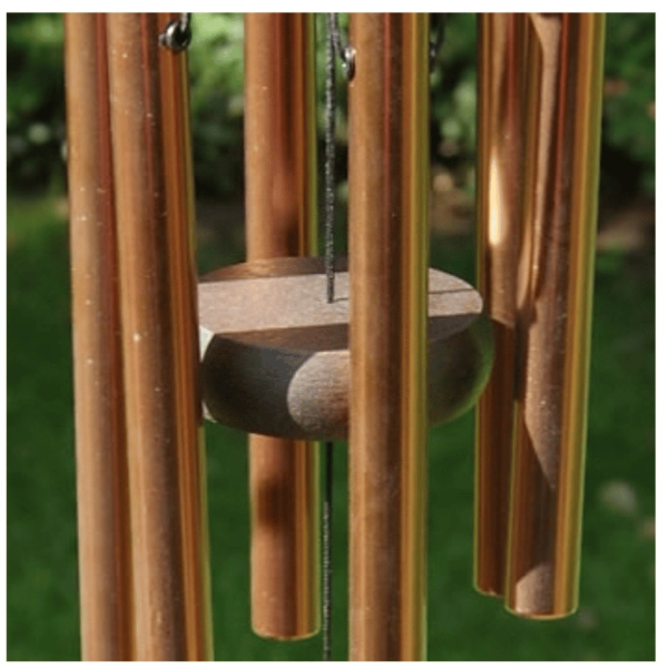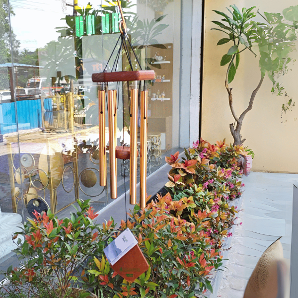 The wind chimes in the Tulsi Home Store are made of aluminum with a rose gold color. They give a soft sound in the breeze and are good for home or balcony use.