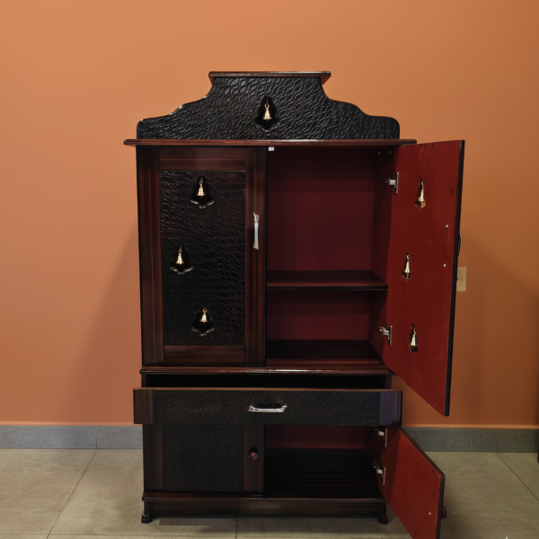 This elegant puja space is made from high-quality MDF wood with a combination of rich rosewood and dark walnut colour finish that gives a premium wooden look. It is strong, durable, and perfect for daily pooja use. This design has been made simpler. The smooth surface is easy to clean and maintain for long-term use. This stylish and affordable MDF puja space is available at the best price in Tulsi Home Store and adds a divine touch to your home.