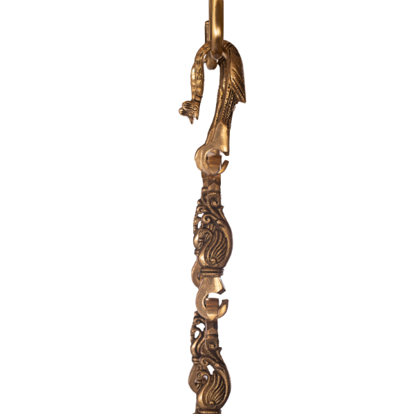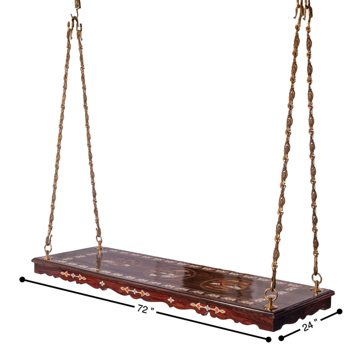 We sell several designs of brass chains that can be found in this site as well. As shown here, suspended by intricately designed brass chains, this swing exudes vintage charm. The chains are crafted with exquisite detailing, featuring the Annai pakshi that enhance its retro aesthetic. The brass not only provides a sturdy and reliable suspension but also complements the rose wood with its warm golden hue, creating a harmonious contrast.