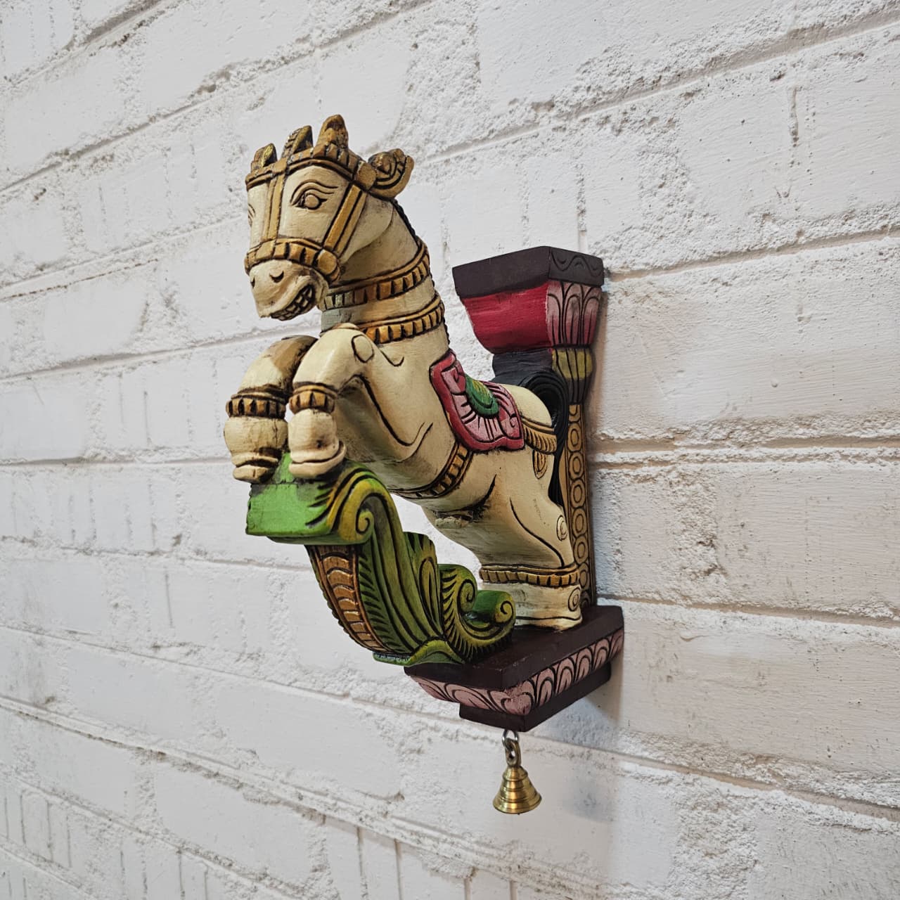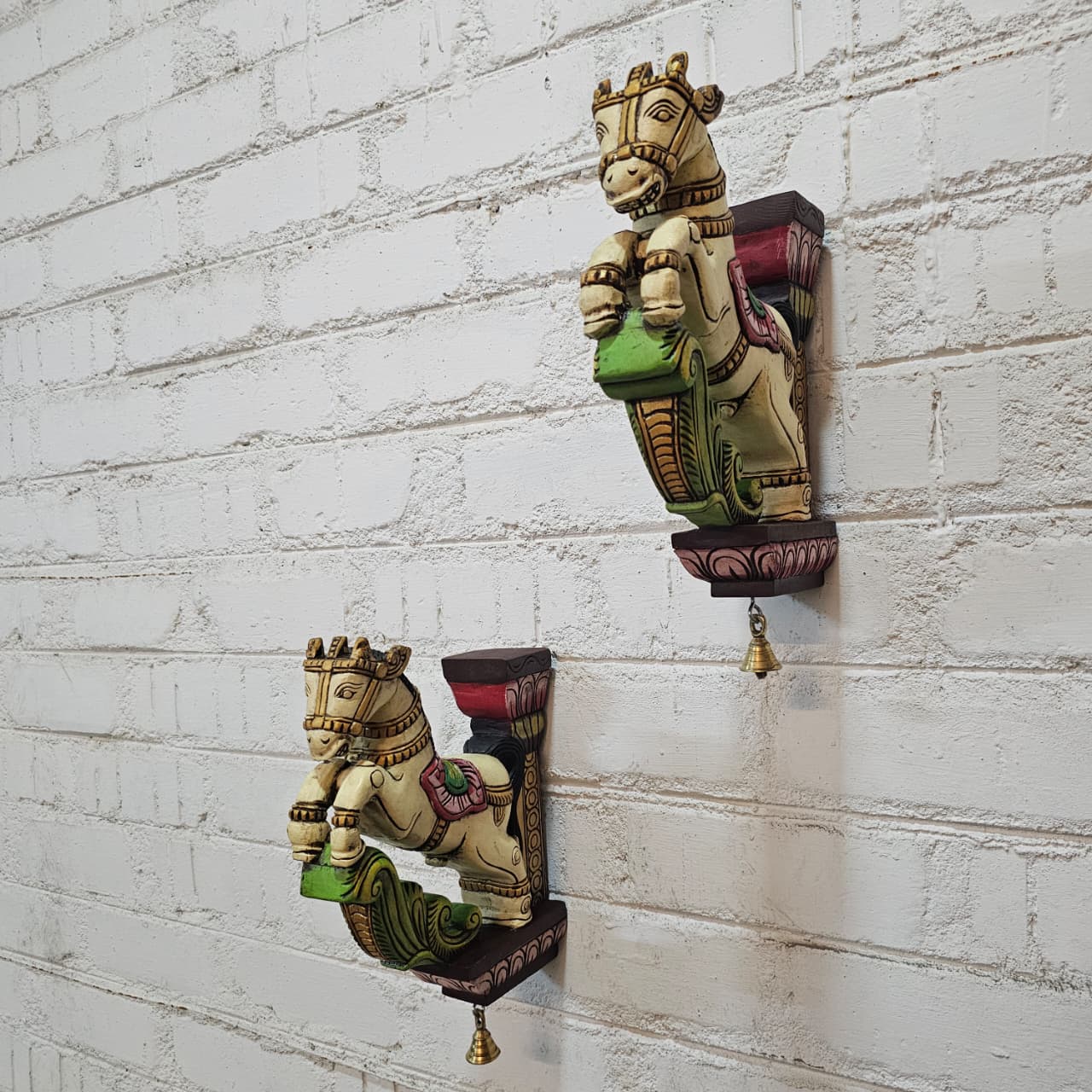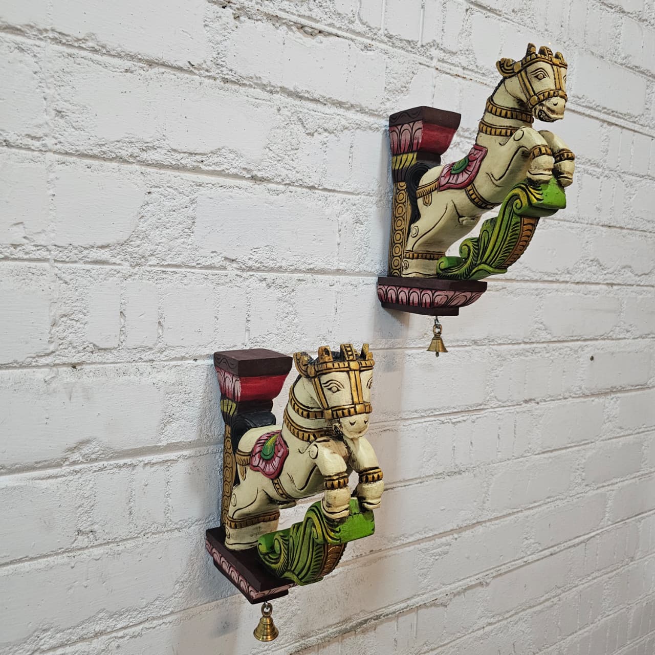 The wooden horse bracket in Tulsi Home Store is hand-carved with fine detail. It is a strong and simple wall decor piece that brings a traditional look to your home.