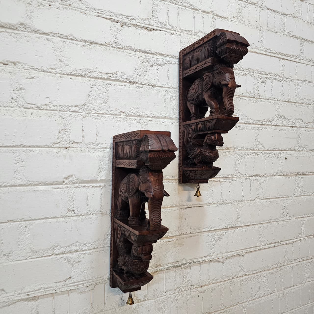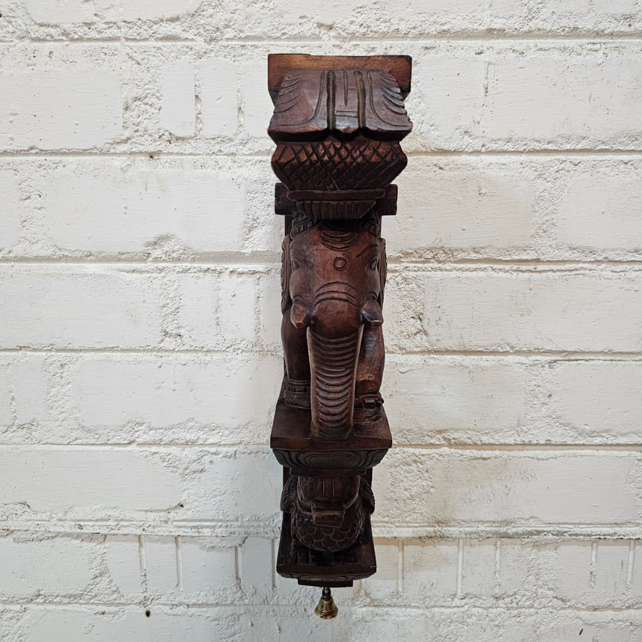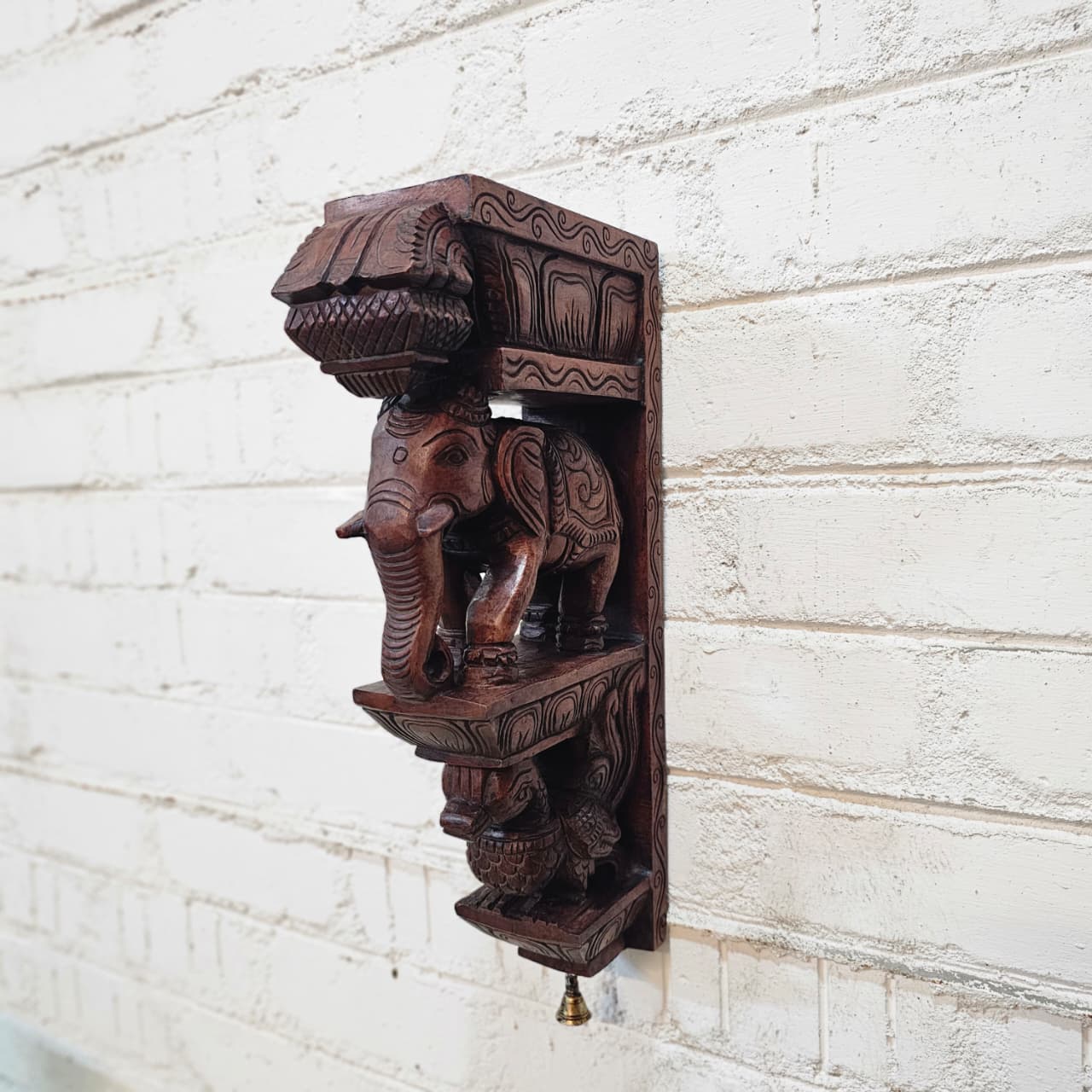 The wooden elephant bracket in Tulsi Home Store is finely carved with strong detail. It is a traditional wall decor piece that adds charm and style to your home.