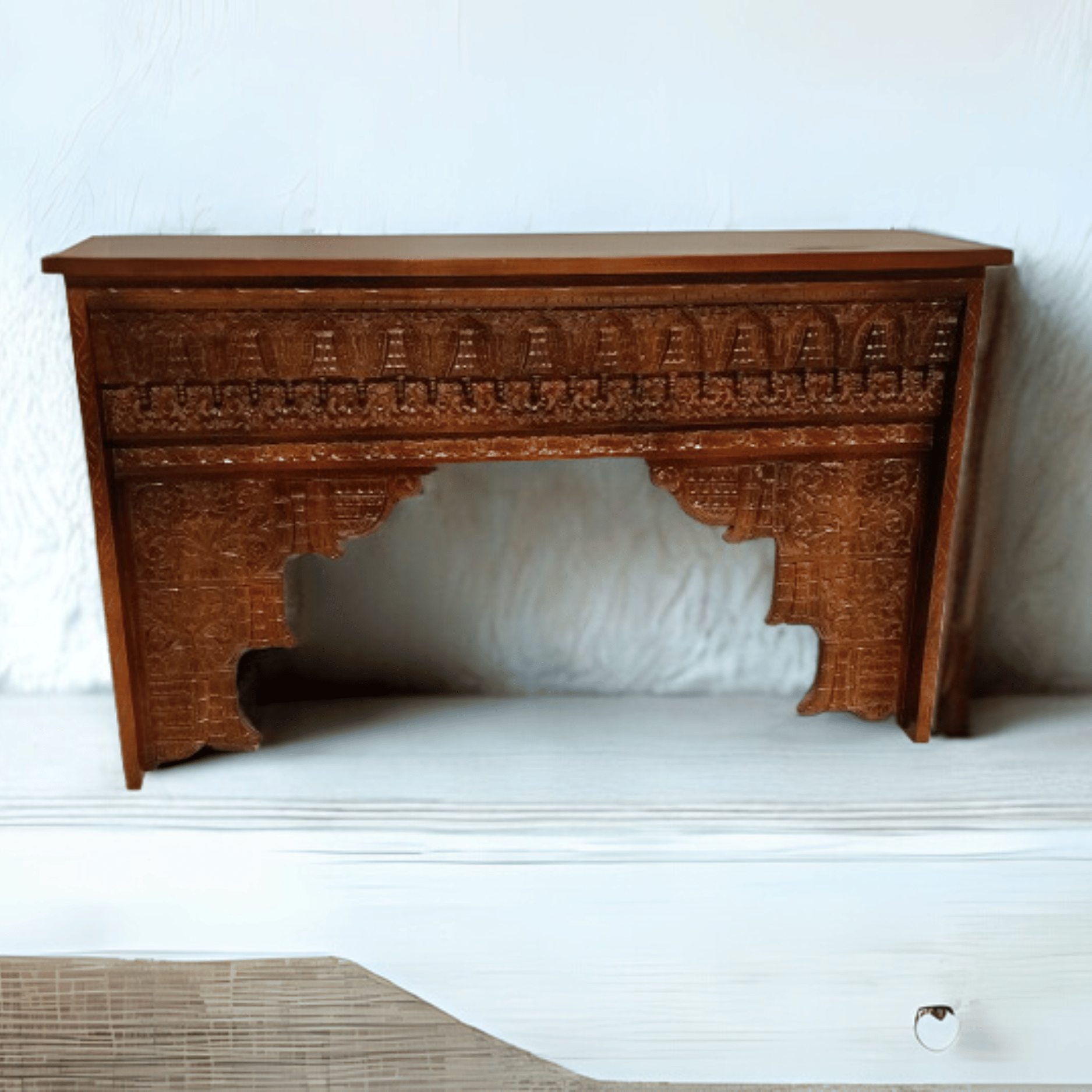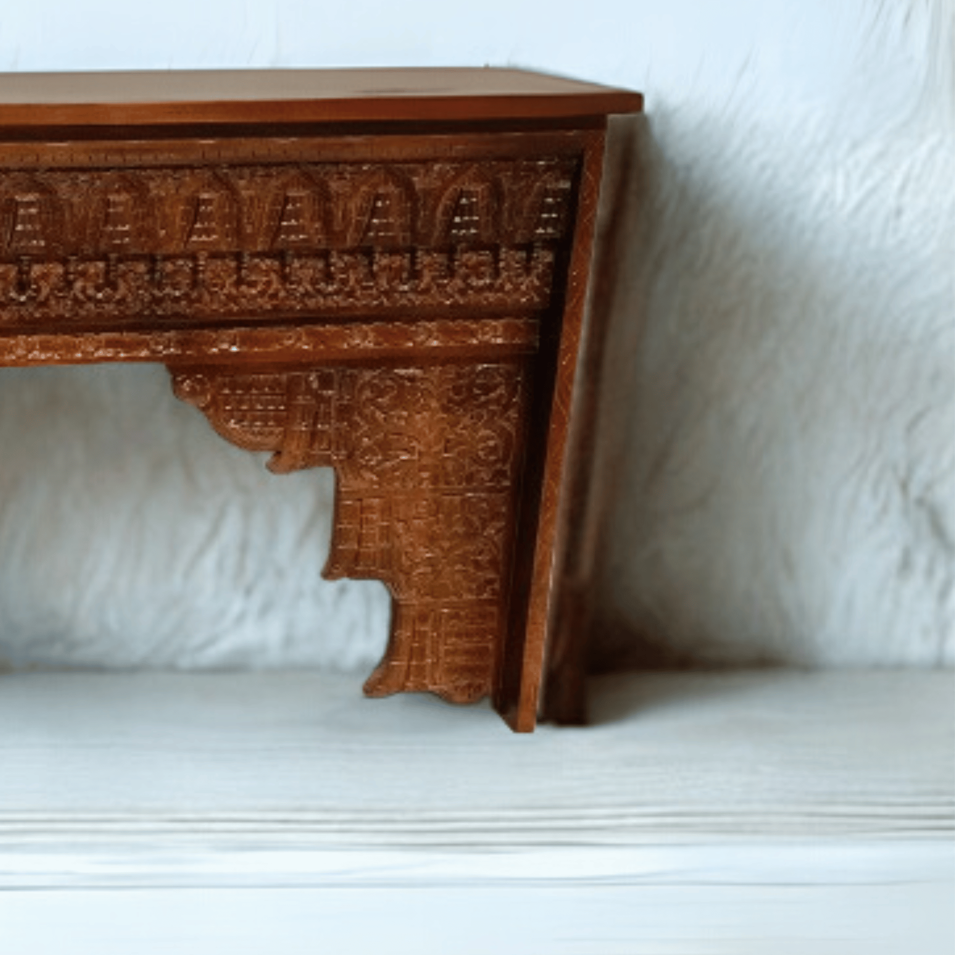 The Wani Mango Wood Console is made from strong mango wood and has a simple brown finish. It is hand-carved with traditional designs, giving it a natural and classic look.