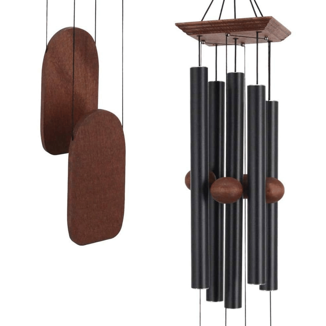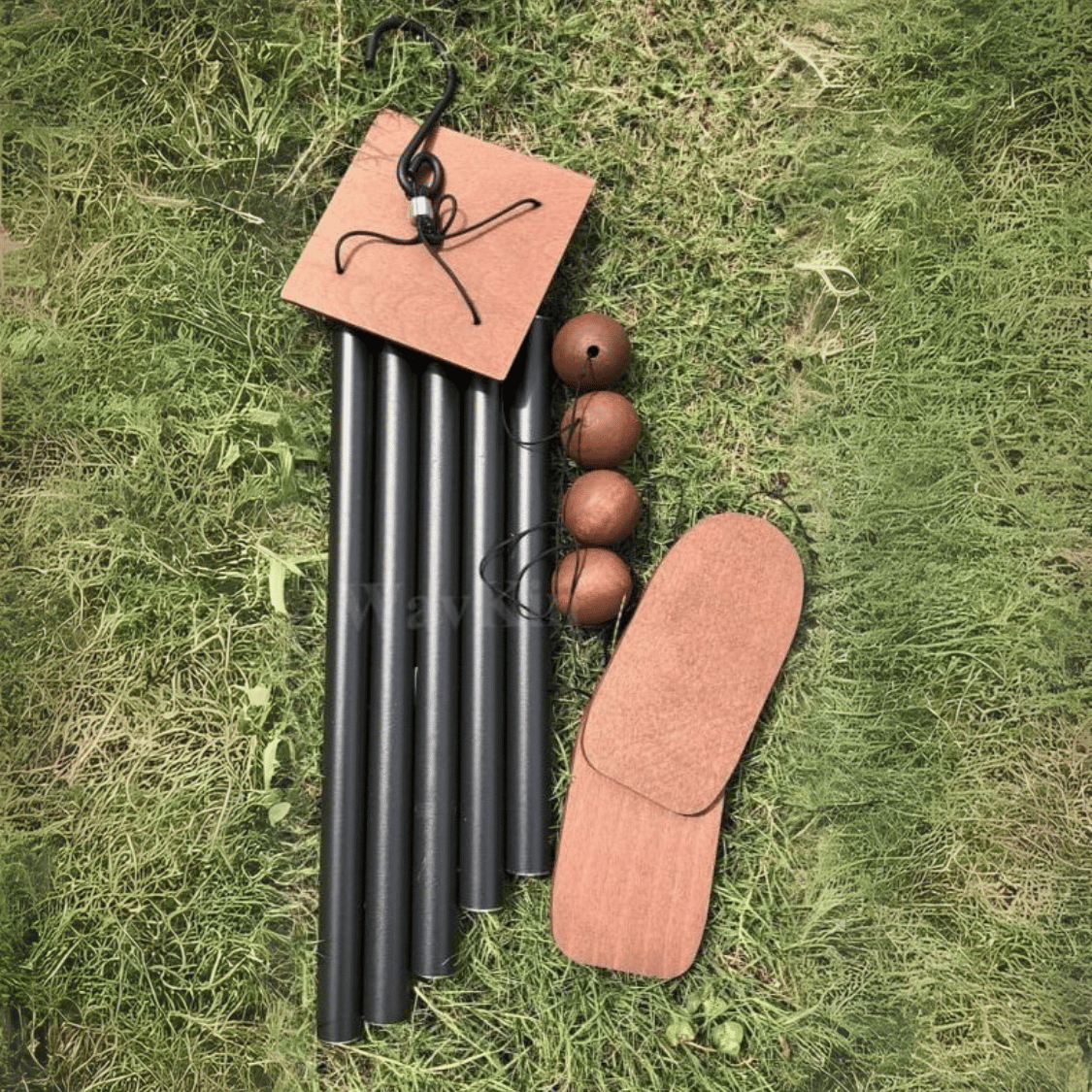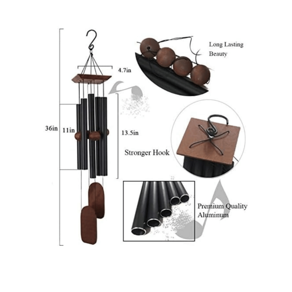 The wind chimes in the Tulsi Home Store are made of aluminum with a black color. They give a soft sound in the breeze and are good for home or balcony use.