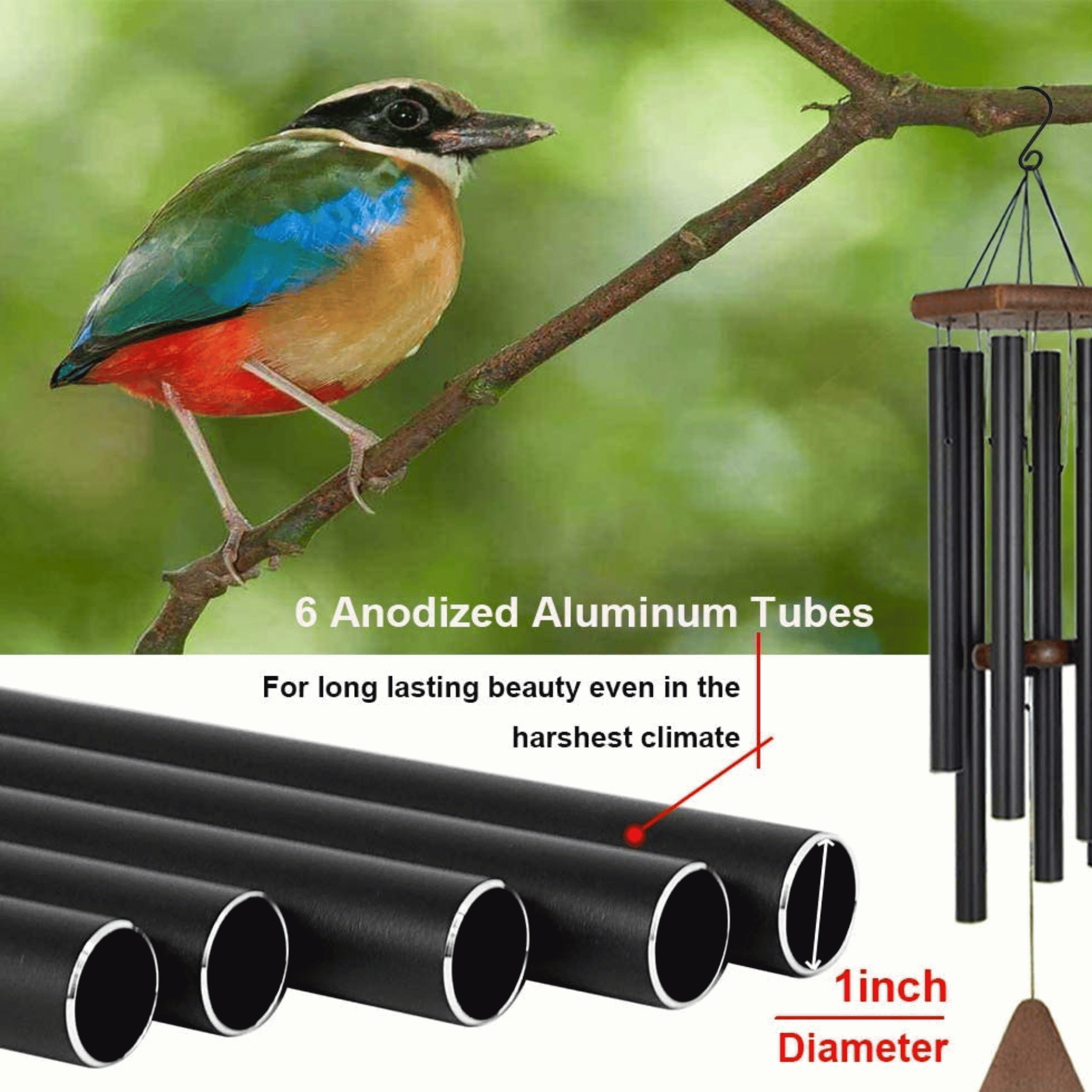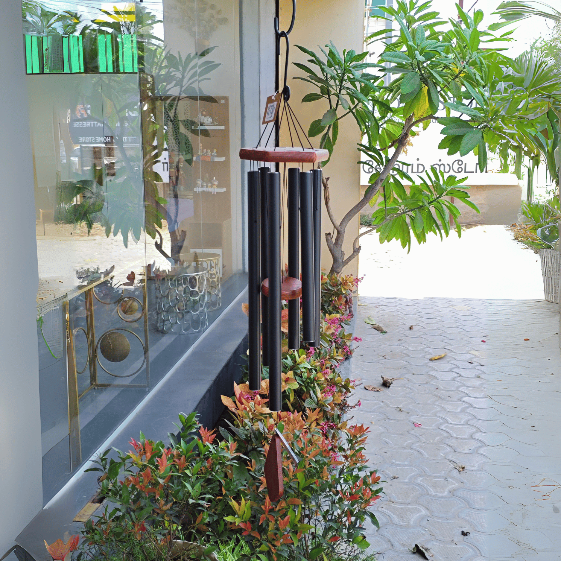 The wind chimes in the Tulsi Home Store are made of aluminum with a black color. They give a soft sound in the breeze and are good for home or balcony use.