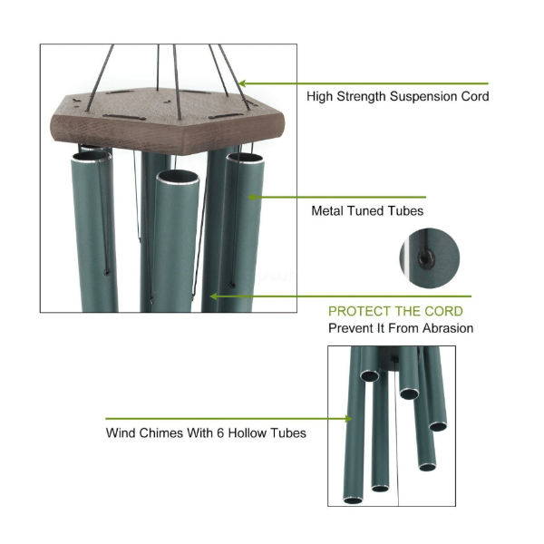 The wind chimes in the Tulsi Home Store are made of aluminum with a forest green. They give a soft sound in the breeze and are good for home or balcony use.