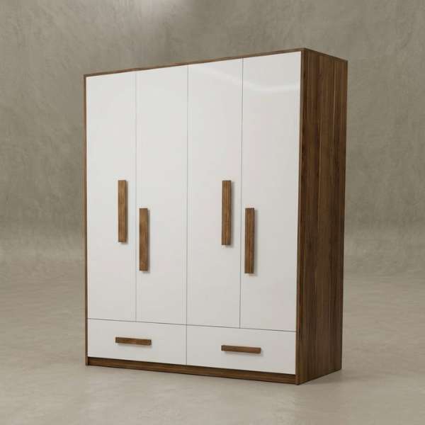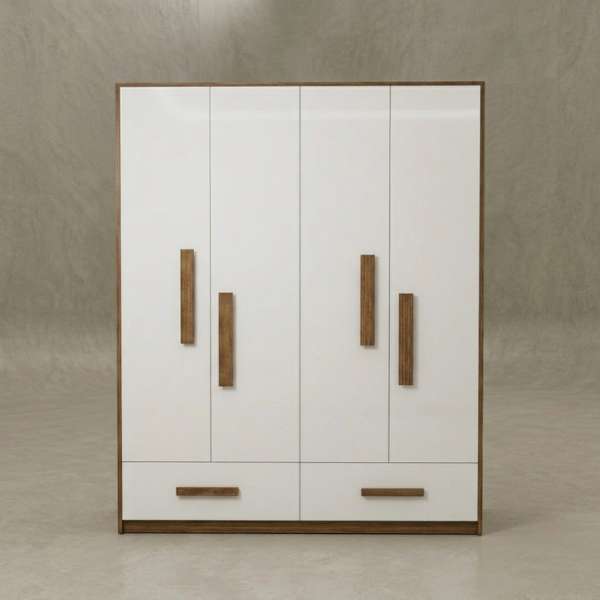 This 4 door wardrobe is made from strong particle board and designed for modern bedroom spaces. It features a clean white UV finished door with natural wooden borders and matching long wooden handles, giving it a simple and elegant look.