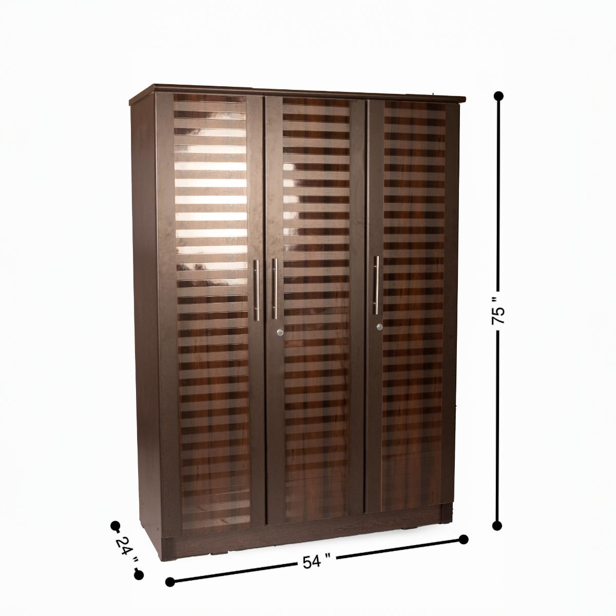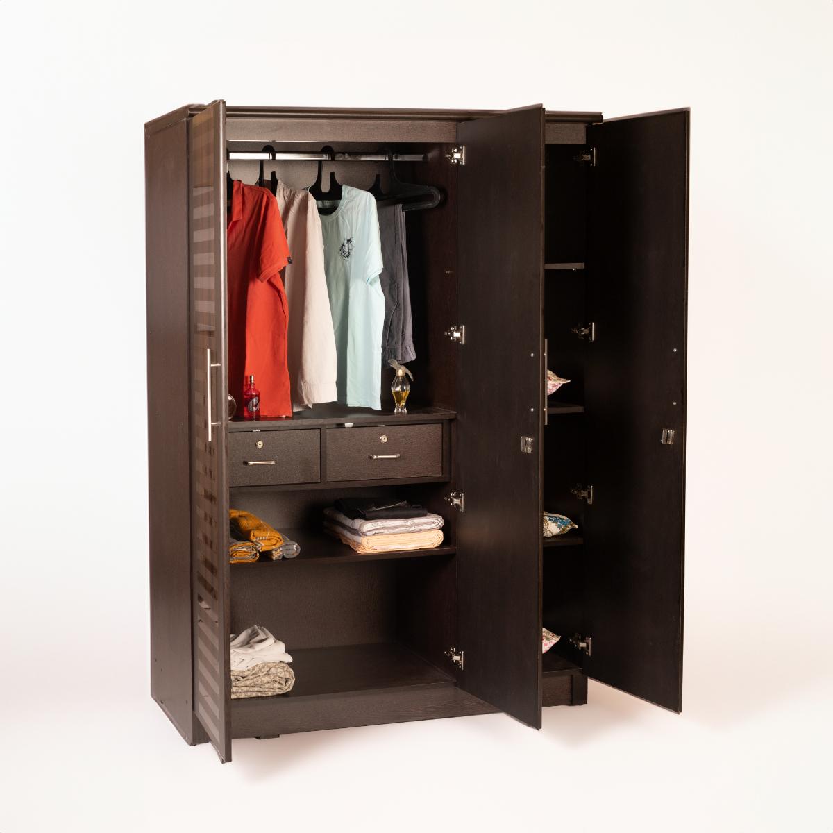The Coco 3 Door is all about functionality. A hanger space along with 2 drawers goes into the Left side double door, while the right side single door gives full storage space. It has multiple shelves within to enable easy storage of clothes, bags and other articles.