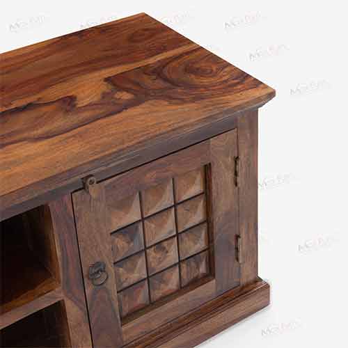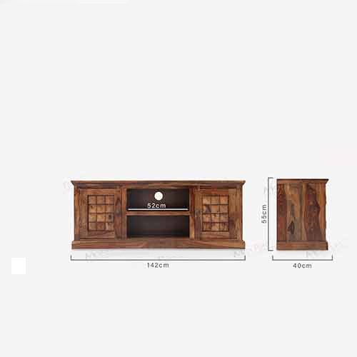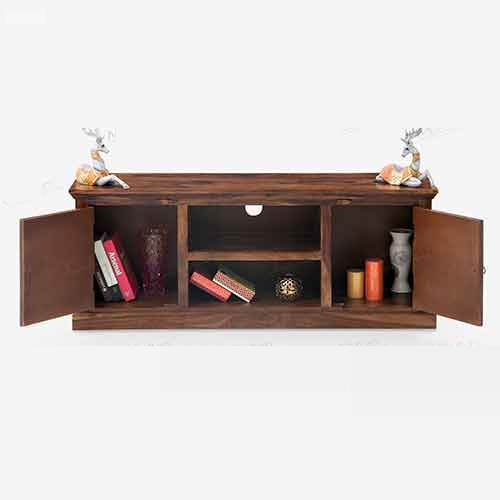 This unit which is almost 5 feet in length is good for LCDs upto 60 inches. It has 2 doors on either side and the centre part has a shelf that can take your set top box, remotes and the like. The David LCD stand in solid wood is a great buy at this price. It will surely add charm to your living area.