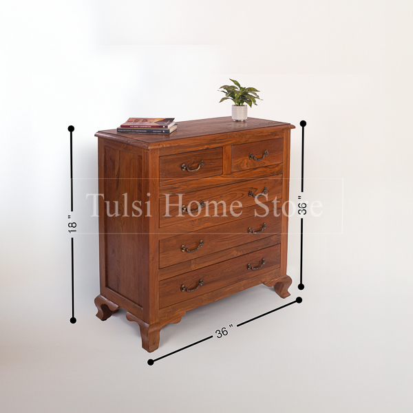 The Gemini teakwood chest of drawers has 2 small drawers and 3 full size pull out Drawers. This cabinet can be placed in dining rooms, living spaces, study, bedroom or hallways. It can also be used in the office as a storage space for your important documents or files. The flat top provides space to display decorative items like vases, photo frames, or plants.