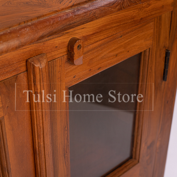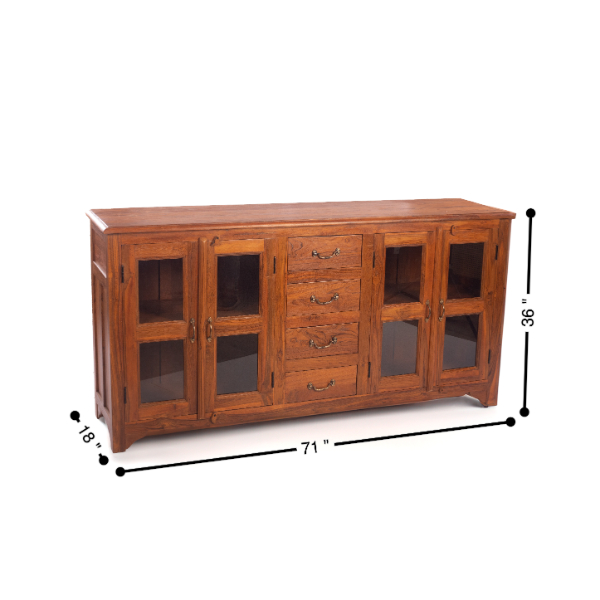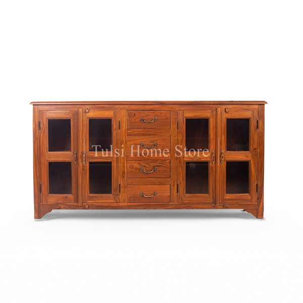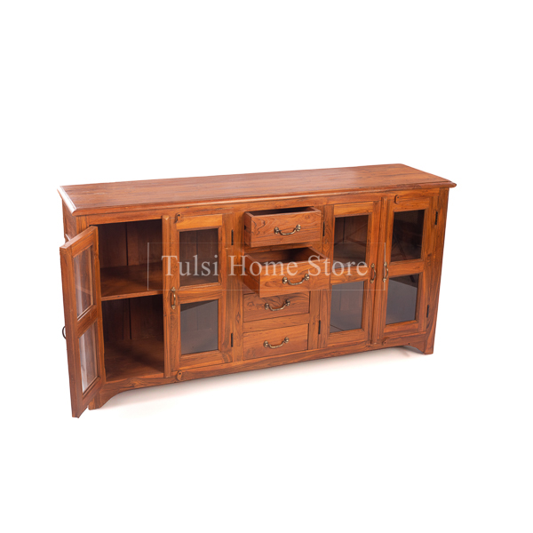 The Quebec Teakwood Side Board has 4 drawers in the middle compartment and two door storage units on either side of the drawers. Side boards have multi uses and can be placed in dining rooms, living spaces, study, bedroom or hallways. In the dining, use the draws to store your cutlery, cups, mugs, linen and the like. Your fav crockery can go on the two glass door cupboards. It can be a huge storage space in your bedroom housing your linen, towels, inners etc. It can also be used in the office as a storage space for your important documents or files. The flat top provides space to display decorative items like vases, photo frames, or plants.