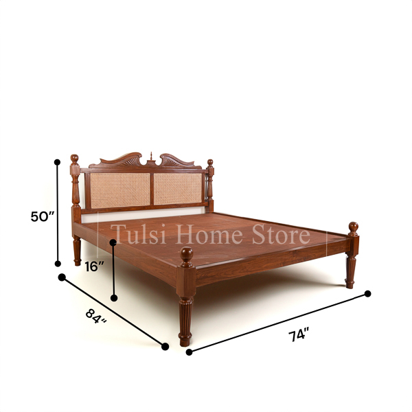 The Rahil King Bed is crafted from durable teakwood, designed for longevity and natural appeal. It features a cane headrest for a touch of texture and comfort, providing ergonomic support.