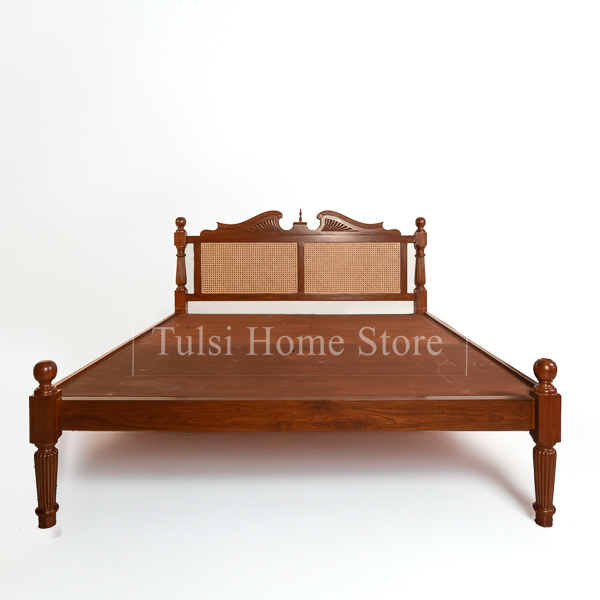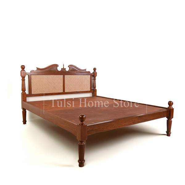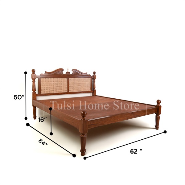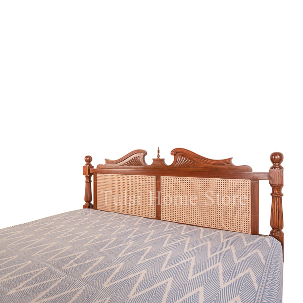 The Rahil Queen Bed is crafted from durable teakwood, designed for longevity and natural appeal. It features a cane headrest for a touch of texture and comfort, providing ergonomic support.