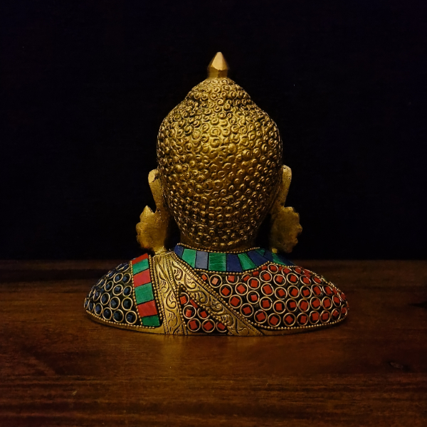 This medium-sized Buddha statue is crafted from pure brass with elegant stone work, featuring the figure from head to chest. It adds a calm and spiritual touch to your space, perfect for home décor or gifting. Available in Tulsi Home Store, Coimbatore.