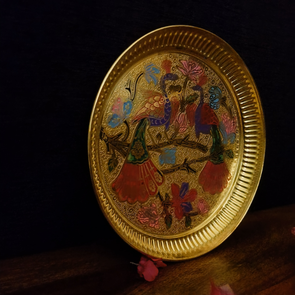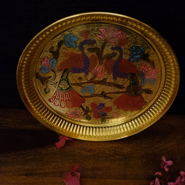 This peacock-designed round plate in pure brass features fine craftsmanship and traditional detailing. Perfect for wall decor, display, or gifting, available in the Tulsi Home Store.
