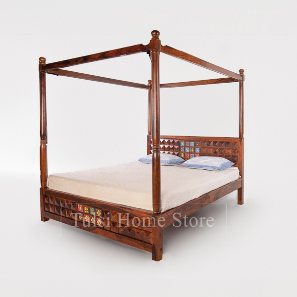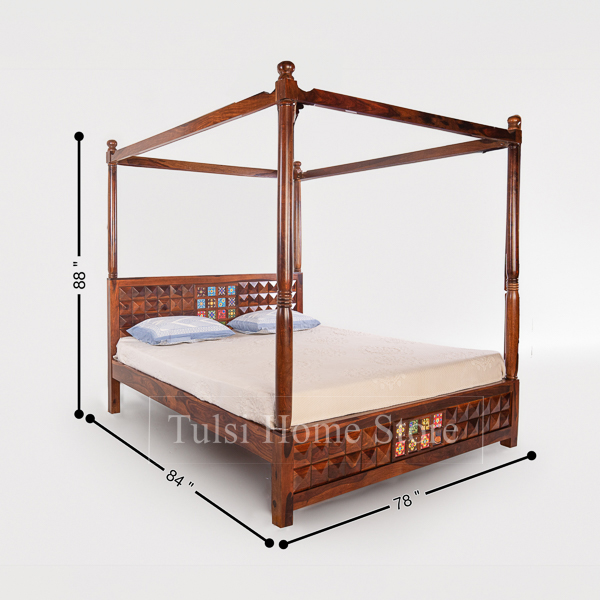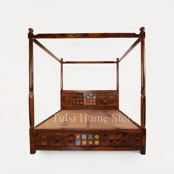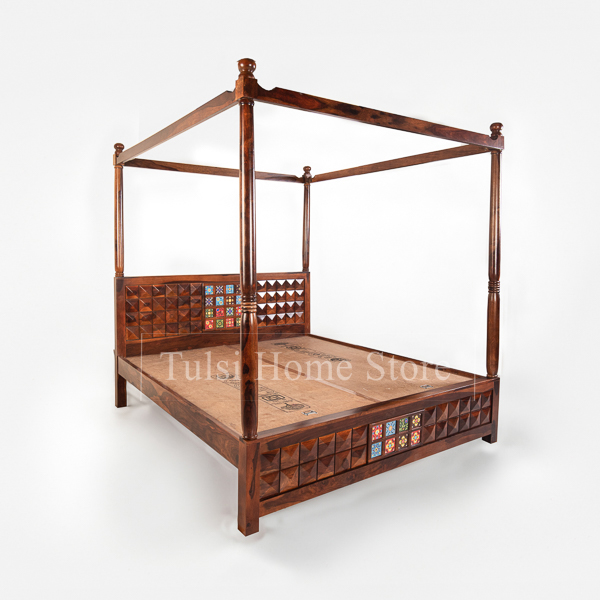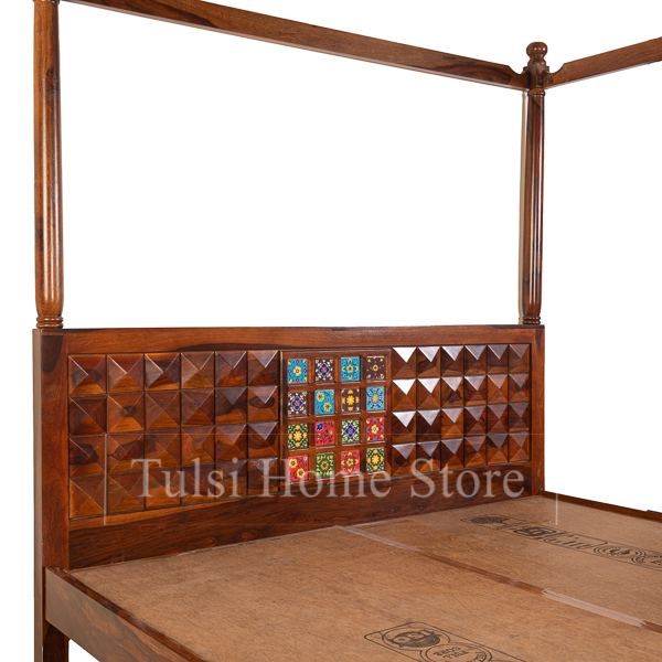 Kahaan Tile Poster Sheesham Wood Bed is a stunning blend of modern design and natural elegance. Made from high-quality Sheesham wood, this bed features a unique tile-inspired 4 poster headboard that adds a touch of artistic flair to any bedroom. Its sturdy construction ensures durability, while the rich, warm tones of Sheesham wood bring a touch of rustic charm. Delve into yesteryear's with this 4 Poster bed without burning a hole in your purse. Tulsi ensures that its products are tested for sturdiness and long lasting ability.