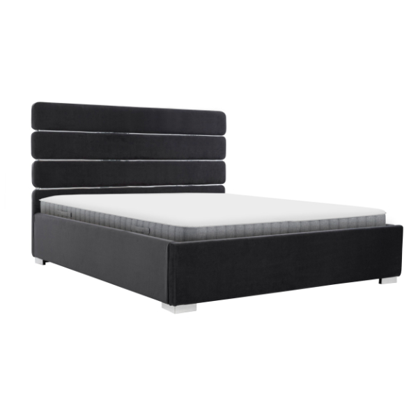 This is a modern fabric-upholstered king size bed featuring a bold, horizontal panel headboard. The frame is fully cushioned and wrapped in fabric, offering a clean, contemporary look. It rests on short, sturdy legs with a metallic finish, adding a subtle touch of elegance. Ideal for those who appreciate minimalist yet stylish bedroom furniture.