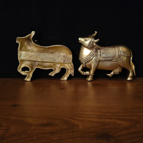 This brass Nandi wall hanging is finely crafted with traditional detailing and an elegant antique finish. Nandi, the sacred bull of Lord Shiva, symbolizes strength, devotion, and positivity, making it ideal for spiritual spaces. Made from quality brass, it is durable and long-lasting.