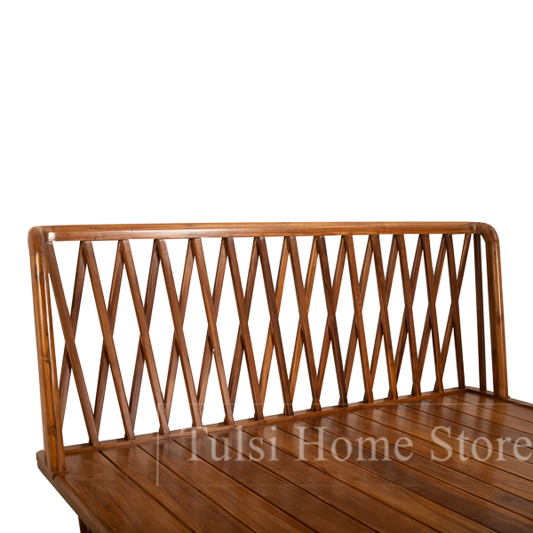 We have 3 models in the Puran beds. The only difference is the design within the barrel wood frame. Take a closer look to see the difference. In the model featured here, we have X shaped teak reapers within the barrel frame. In the other design the rods are given a double sized thickness design. The third design has rods that are straight without any change in the thickness.
