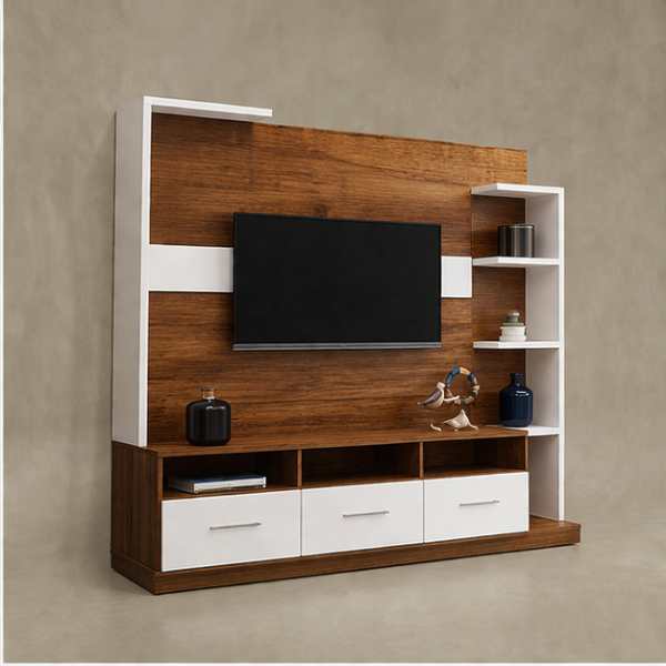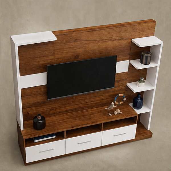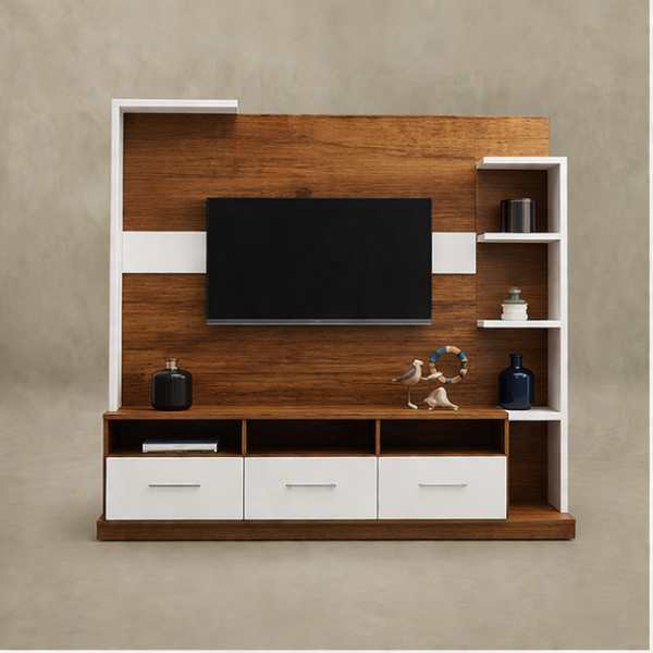 This TV unit features multiple open shelves and 3 spacious drawers, providing plenty of storage for set-top boxes, remotes, books, and decorative items. The side shelving design allows you to display décor pieces, plants, or showpieces while keeping your entertainment area organized. Its space-saving wall-mounted style makes it ideal for both small and large living rooms.